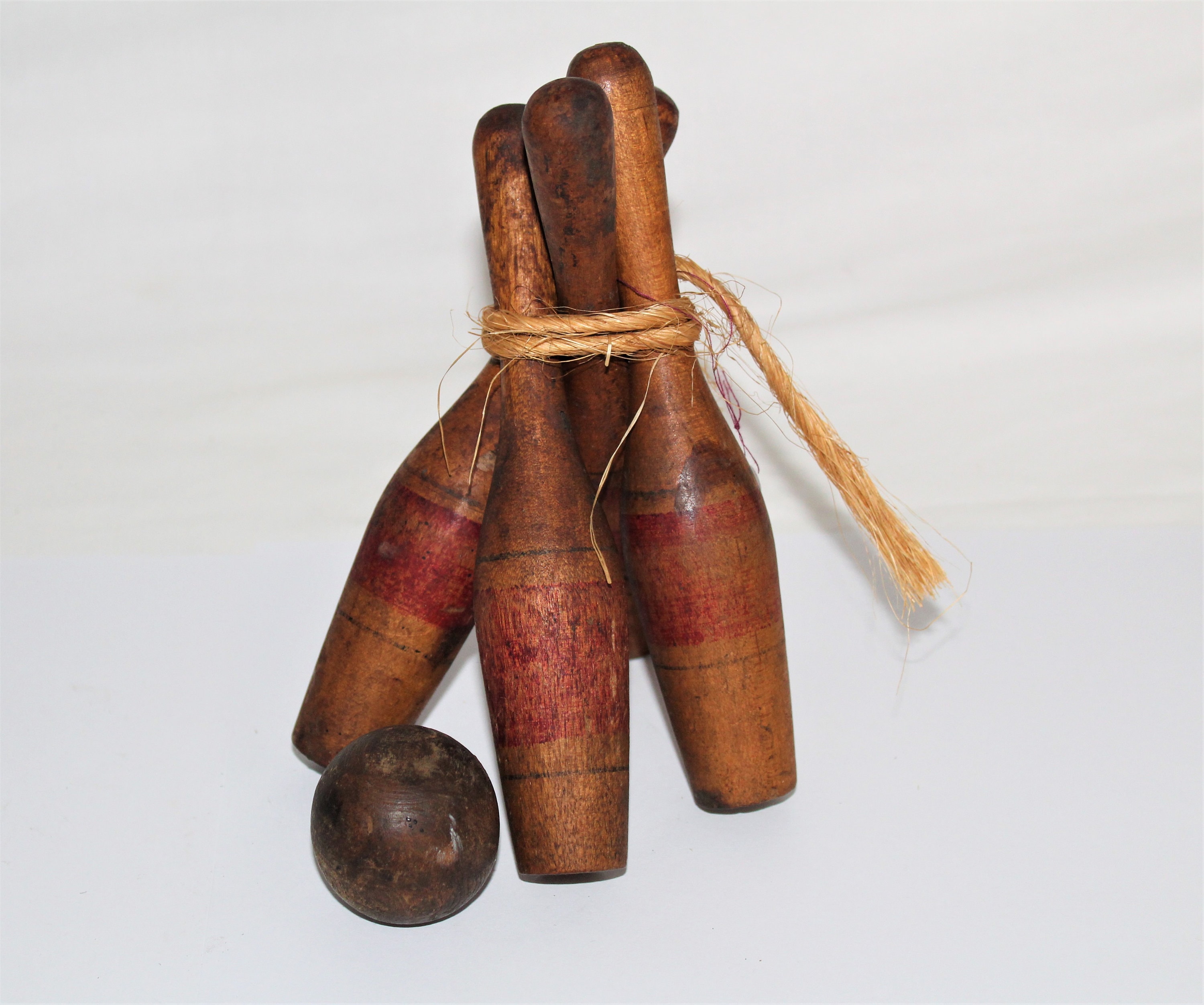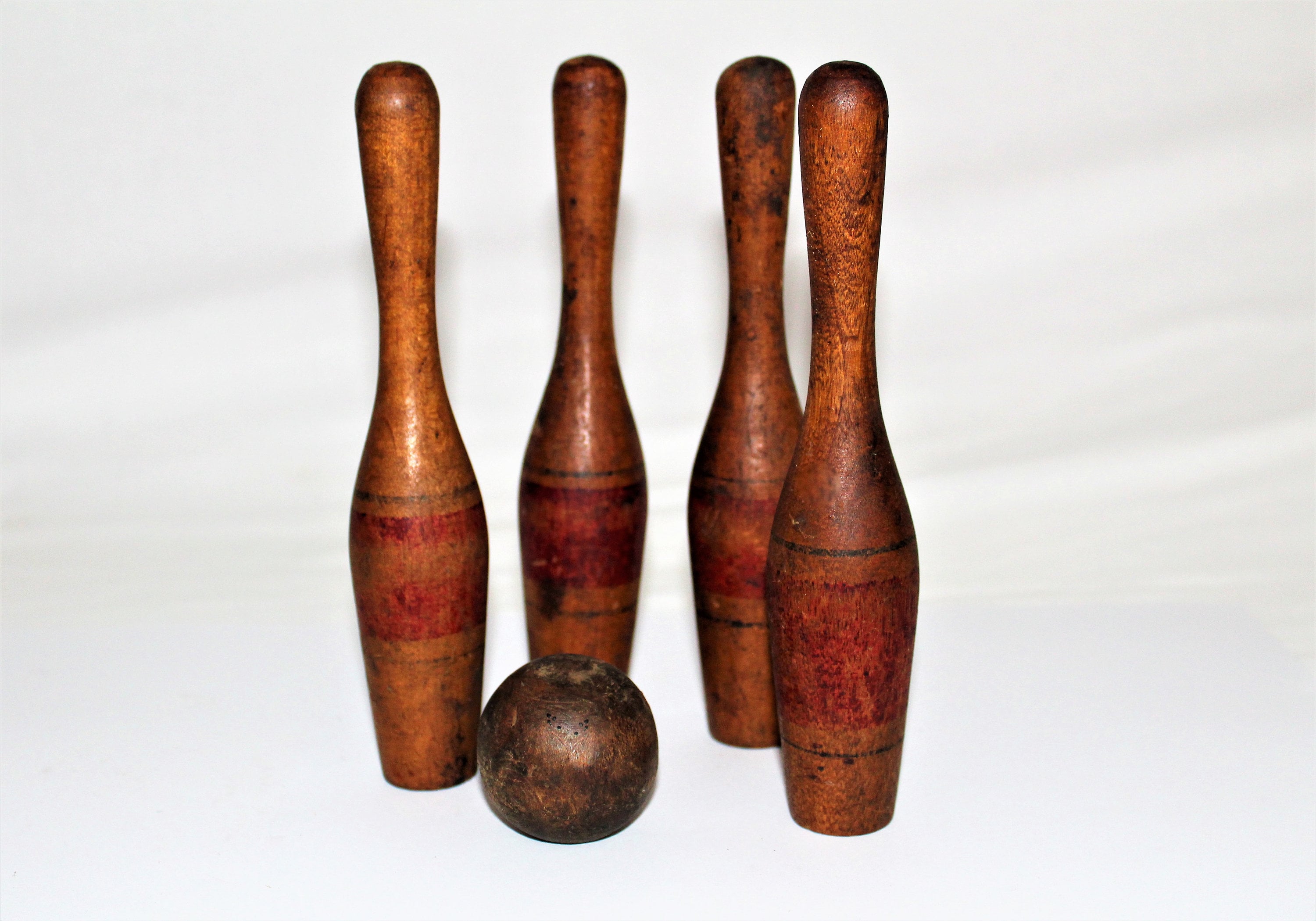 When life was simple and computer free. This wonderful wood toy bowling set with four pins and ball. Will make a wonderful display piece.