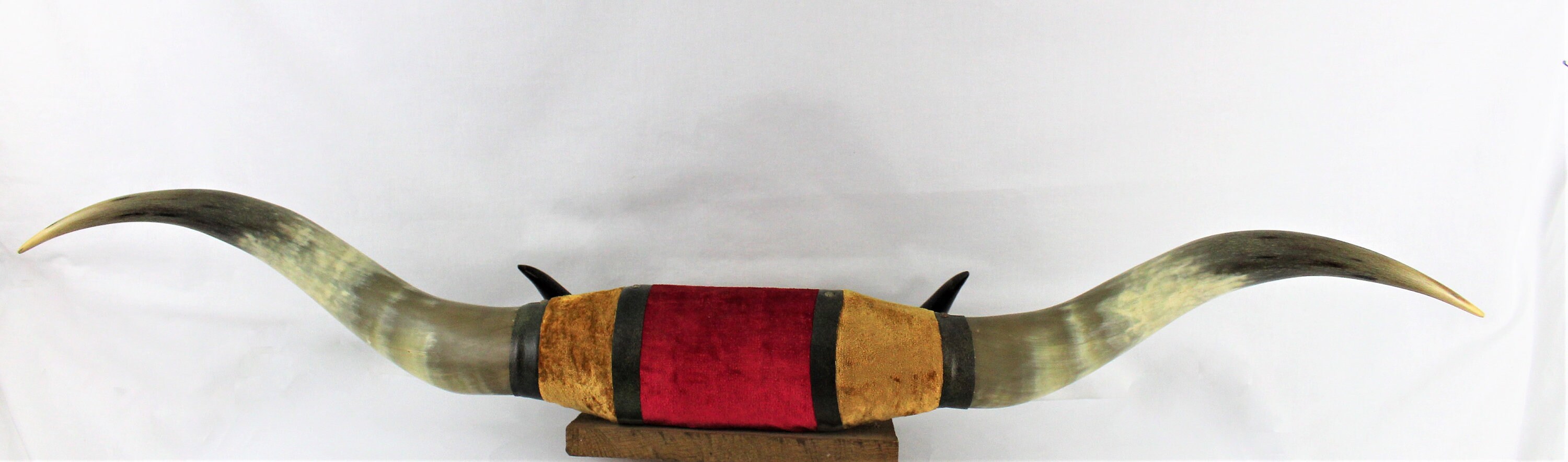 Wonderful twin set of mounted Bull Horns with a velvet décor. The large horns measure 43 ½” wide and the smaller horns measure 15” wide both are solidly mounted to a rustic plank of wood.