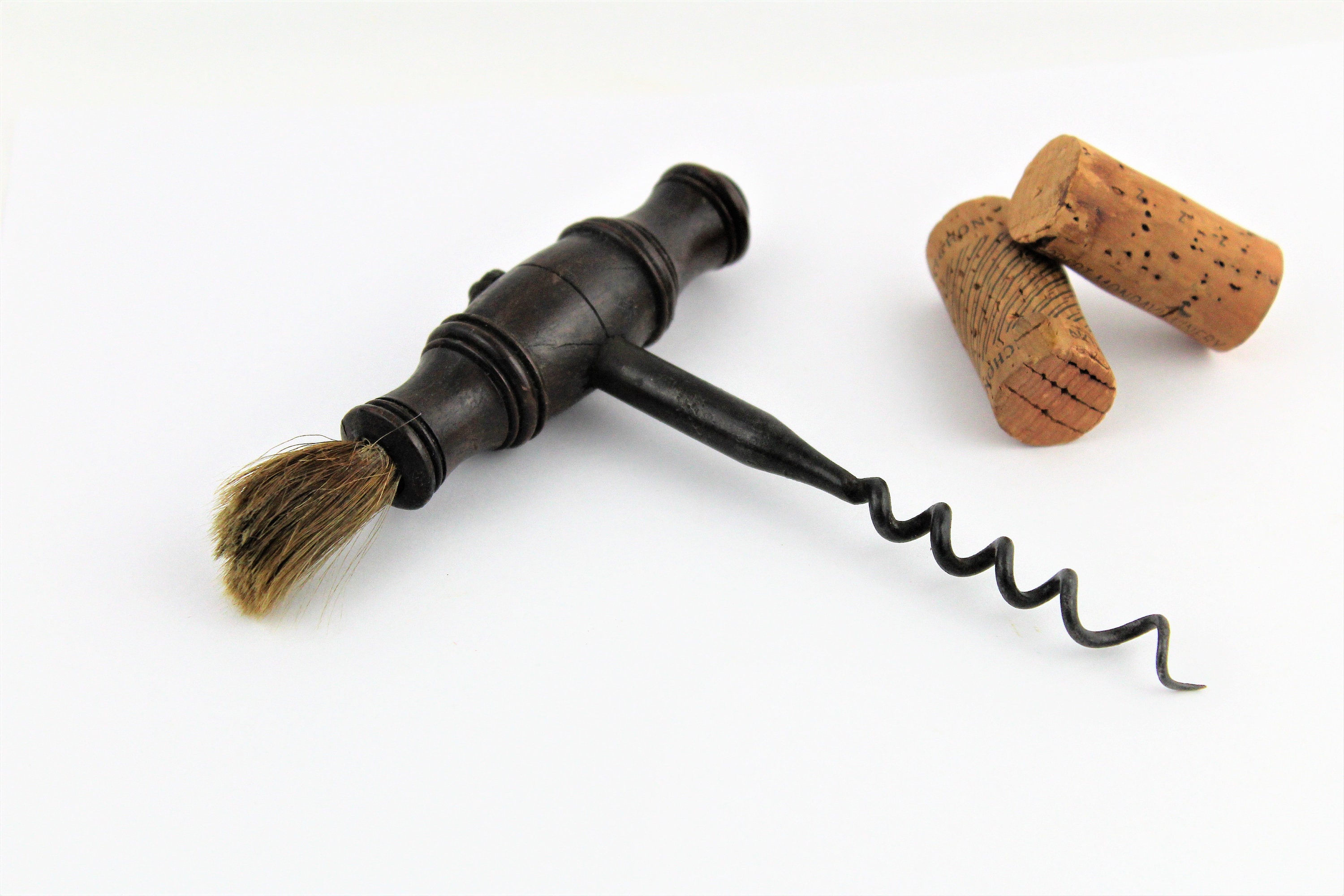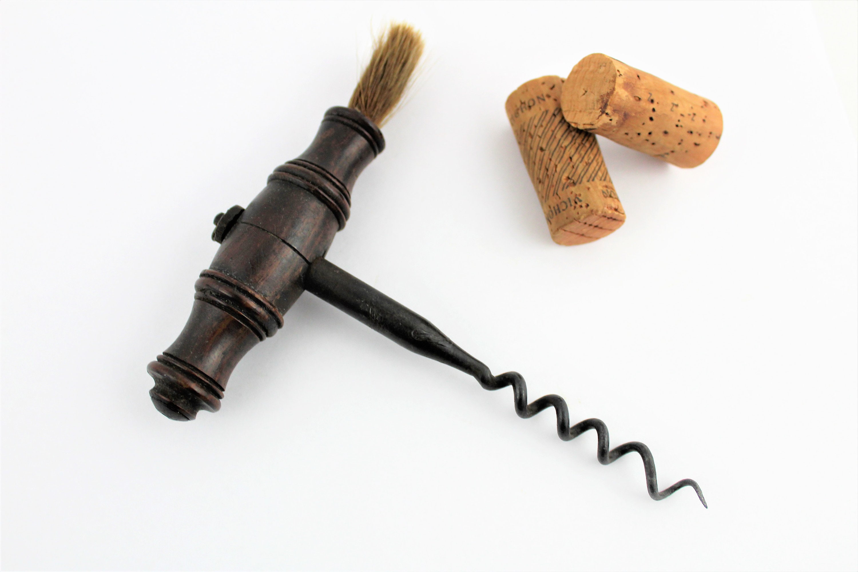 We have for sale an Antique 1880s Ornate Turned Wood Handle Corkscrew with Dusting Brush