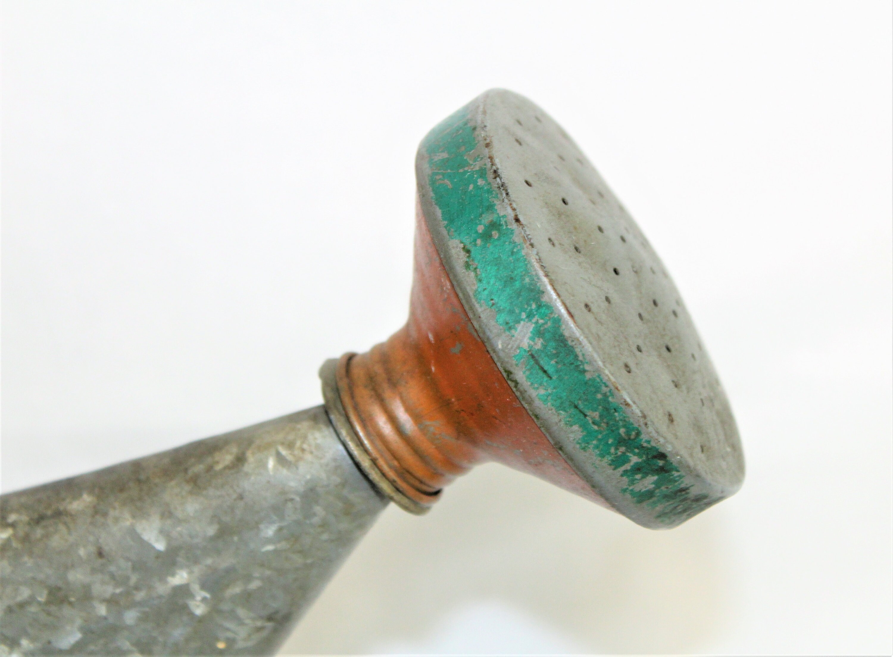 Wonderful 1960s watering can just like Grandma used, made of galvanized steel with removable filtering spout. This is still very solid and holds water just like new has a lovely aged patina with original green and orange paint on spout, hold approximately two gallons of water, large looped handle for easy carrying. Perfect gift for the gardener in your life.