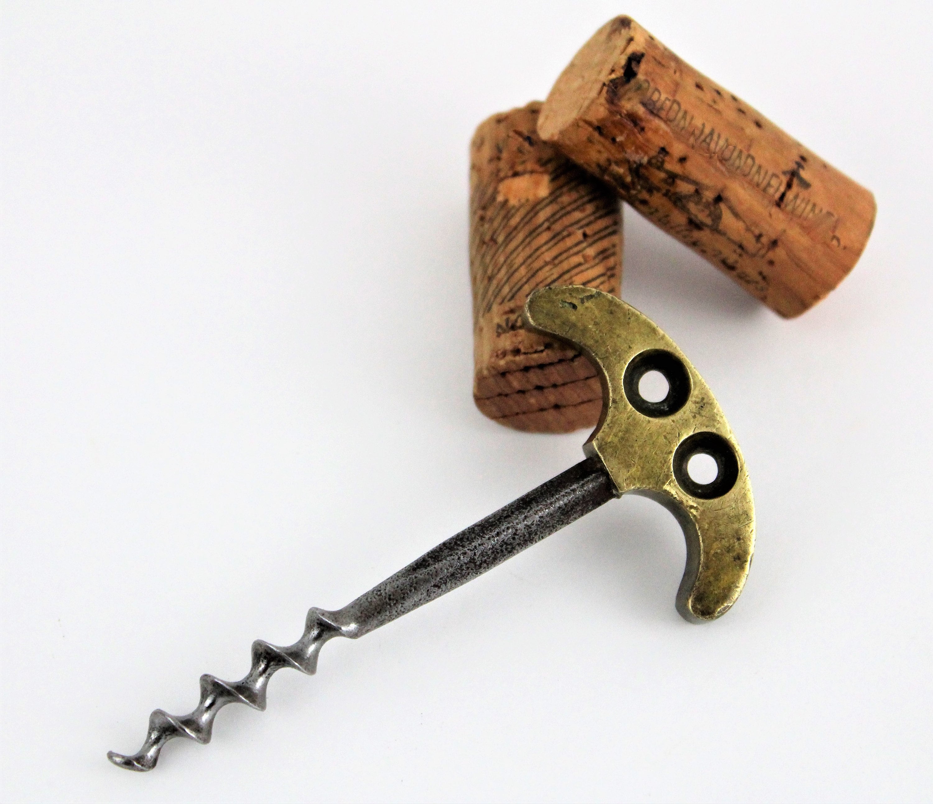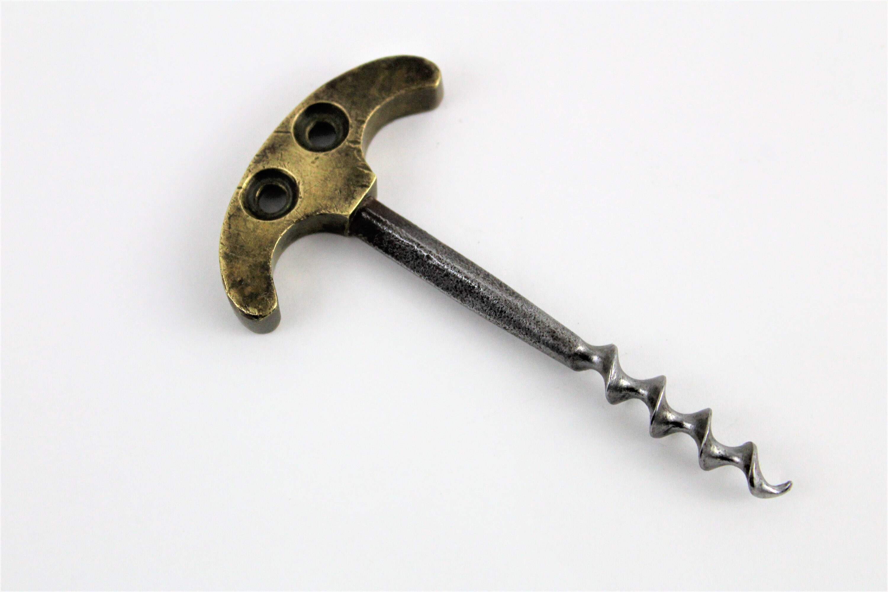 This corkscrew is made with a decorative crescent shaped brass handle and a steel bladed worm (corkscrew)