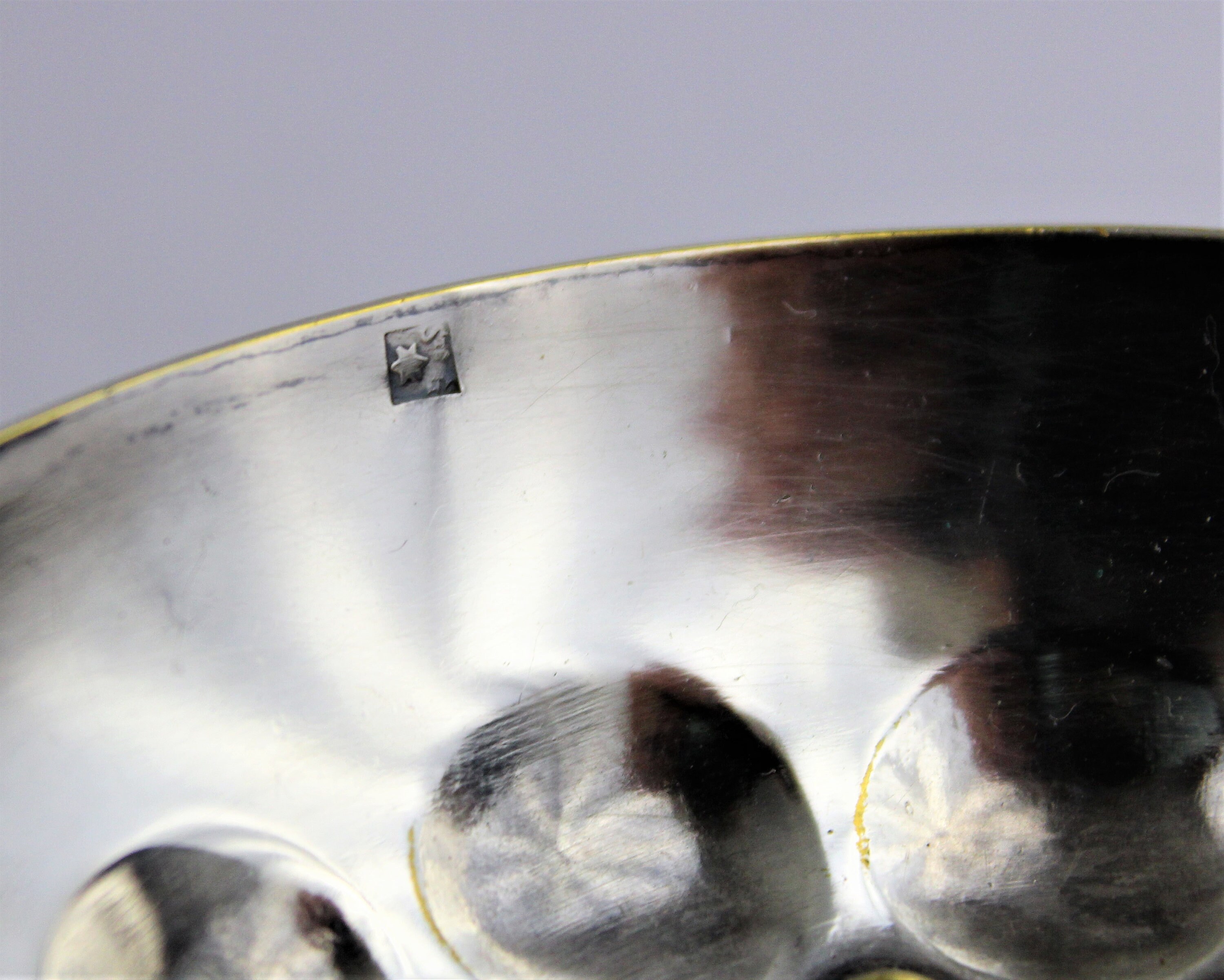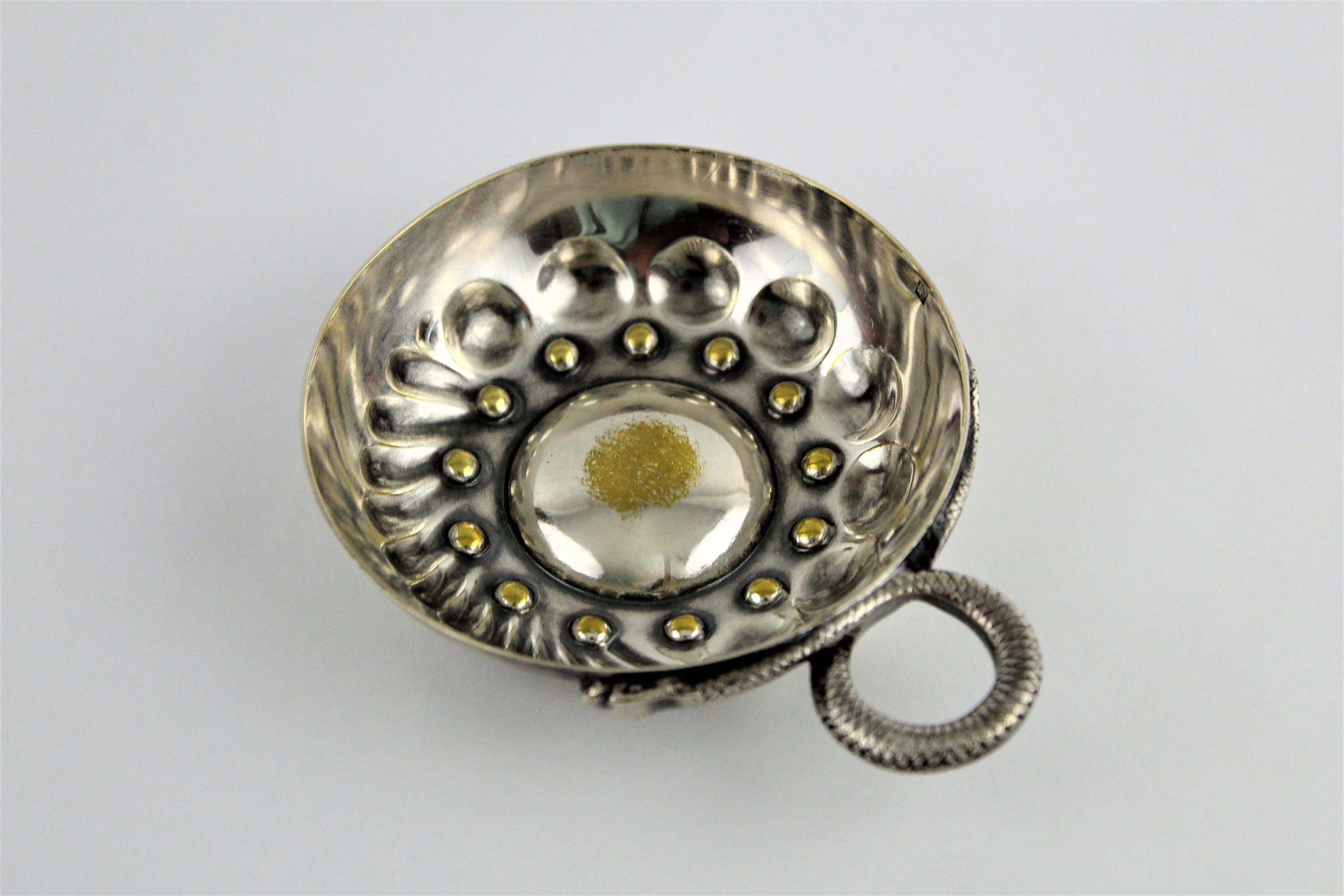 Wonderful Snake handled sommelier tasting cup / tastevin cup. Well loved Tastevin cup the silver plating has worn from hours of tasting wine which only adds to its charm and character. The handle is in the shape of a slithering serpent. There is a makers mark on the inside lip of the cup unfortunately we can not make out the makers mark.