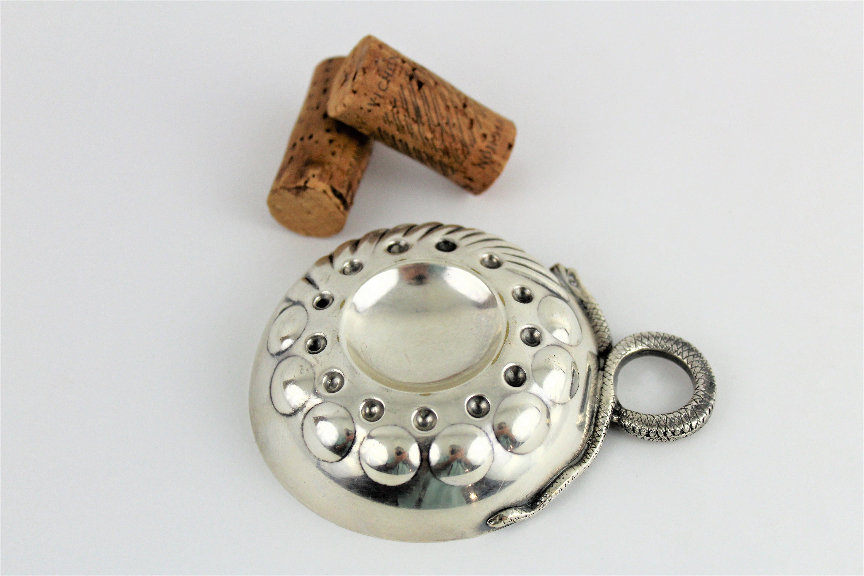 We have for sale a Vintage Snake Handle Sommelier Tasting Cup / Tastevin Cup.
