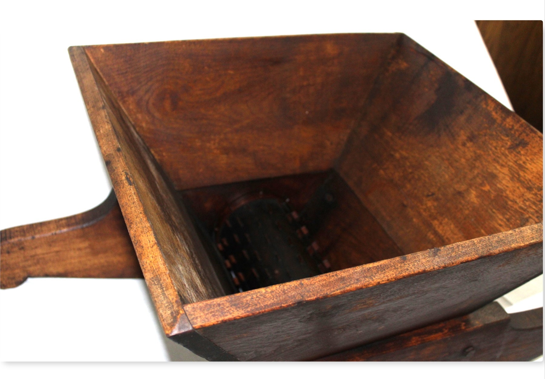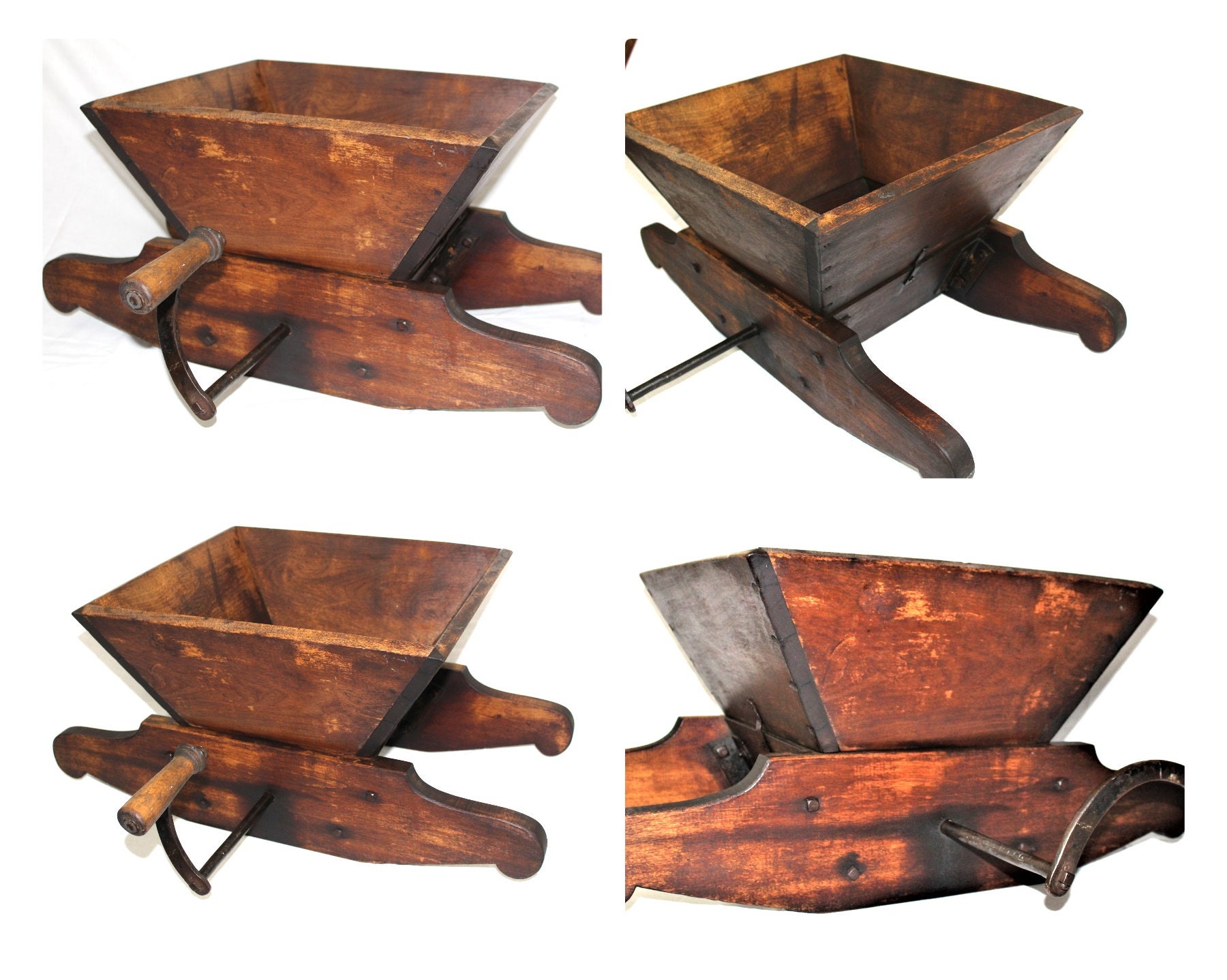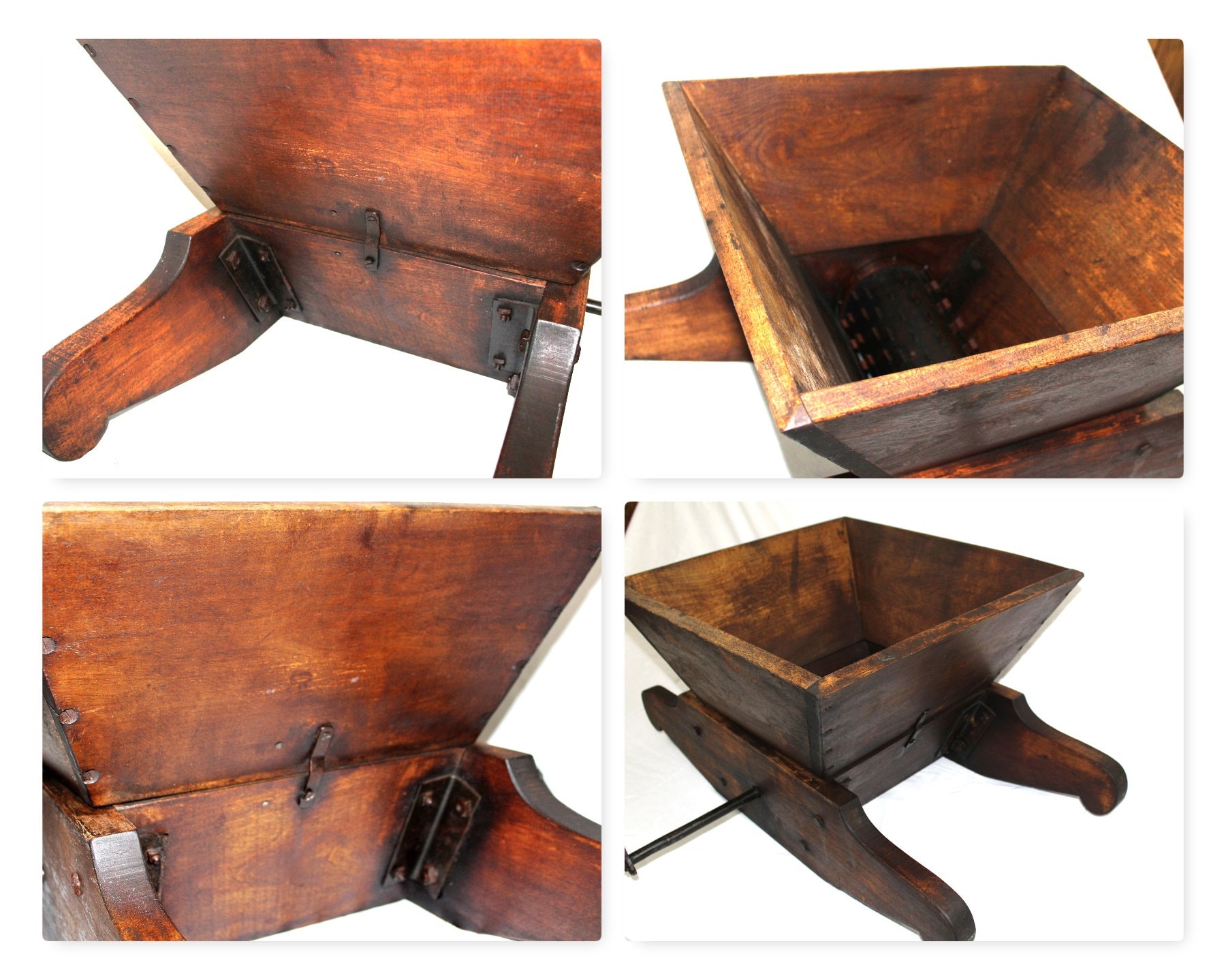 We have for sale an Antique Wood and Cast Iron, Hopper Style Fruit Crusher, Fruit Grinder, Grape Mill with side mounted crank handle.