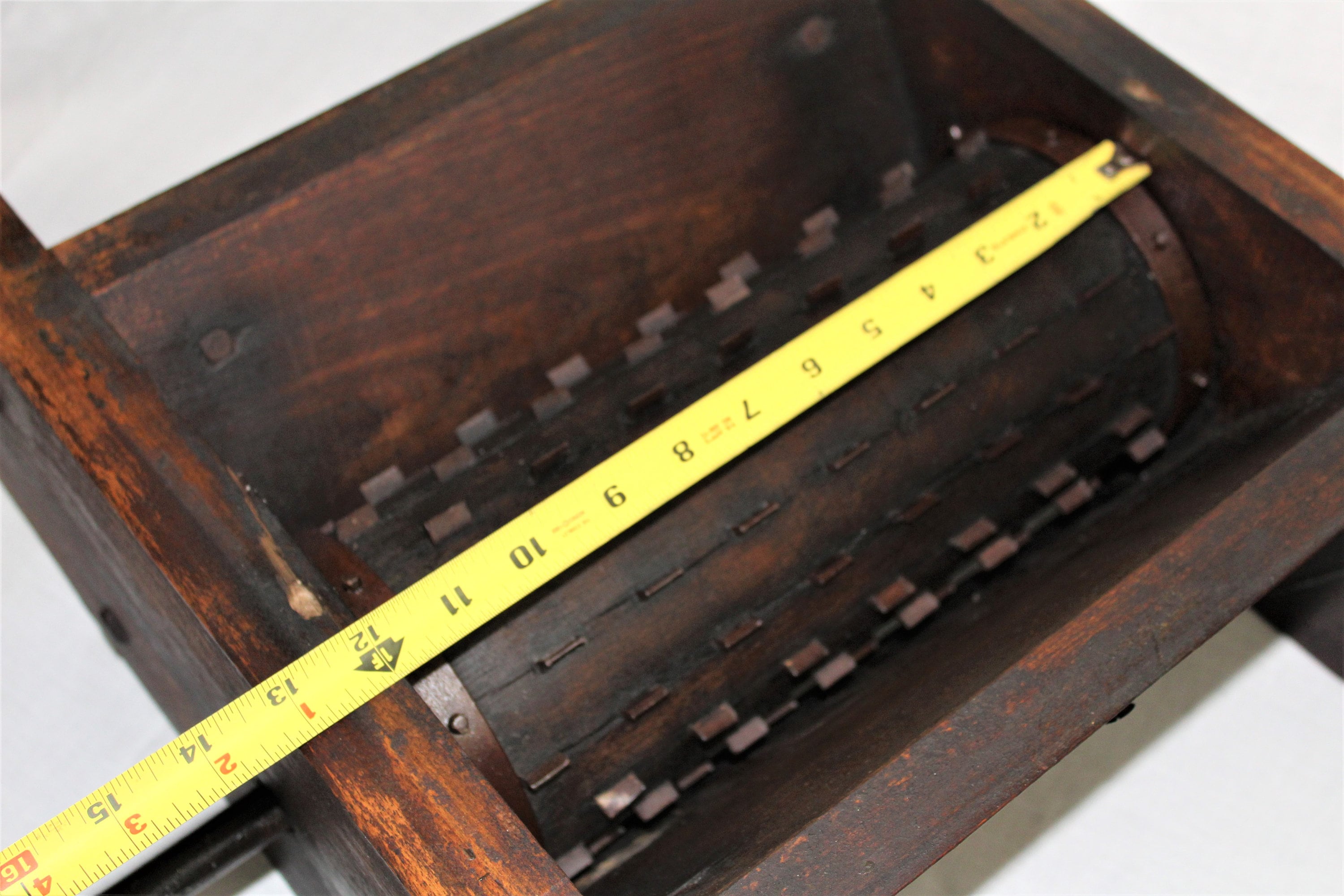The grinder is made of a wood frame and hopper. The wooden grinding wheel has metal teeth and metal arbor that runs to the metal crank with wood handle. The hopper section unscrews and is removable for cleaning purposes. This is a very old design with a wooden grinding wheel as for the exact age, its unknown. It is marked C.B.T. Co. on the cast iron crank shaft.