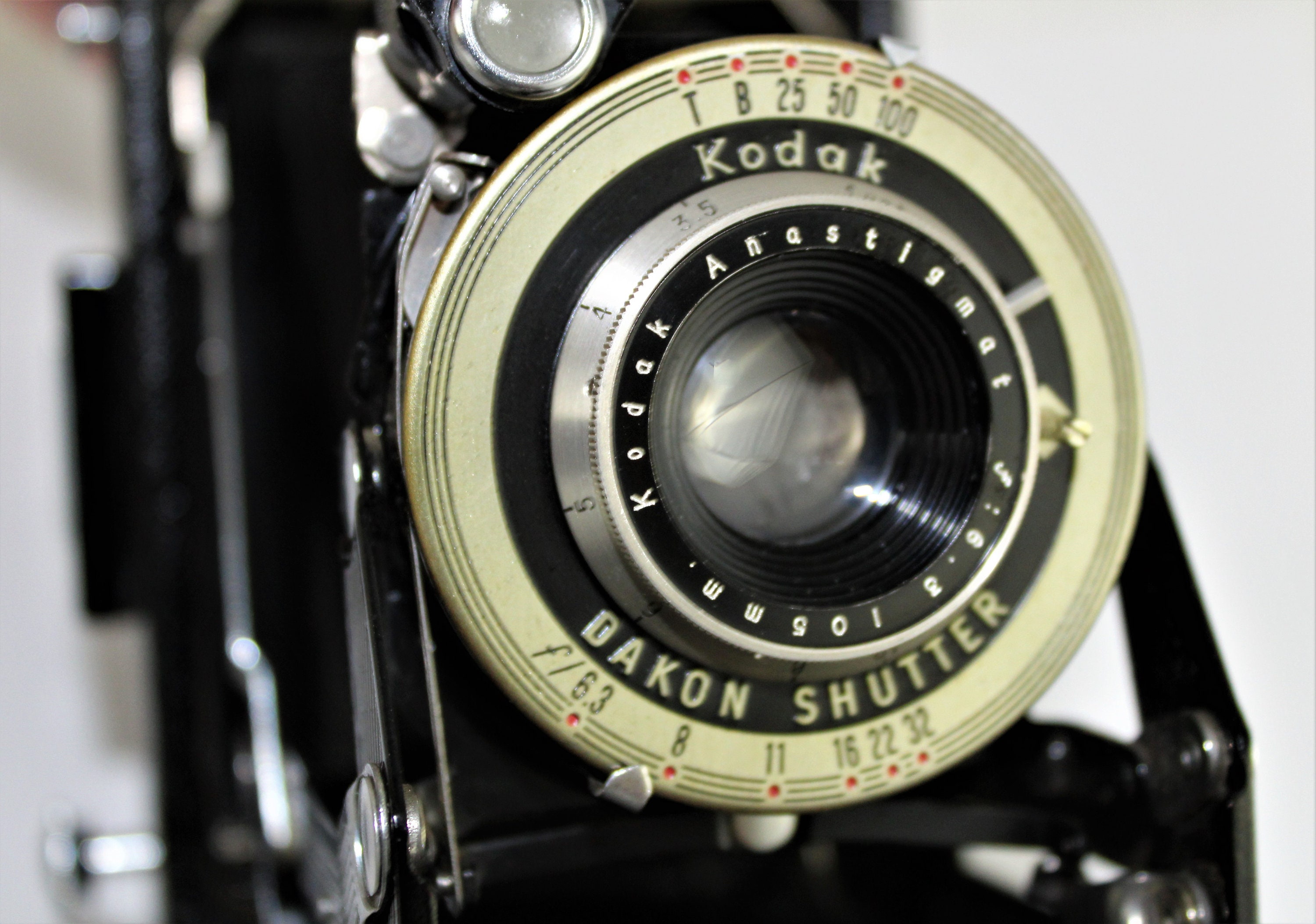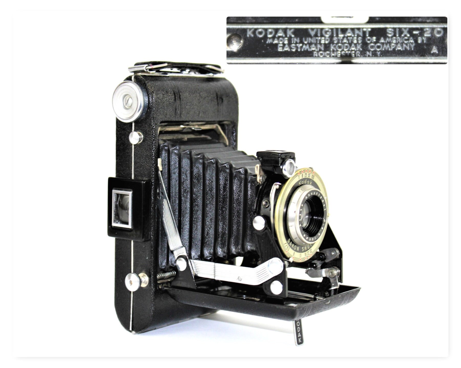 Wonderful folding rollfilm camera with folding optical finder made by Eastman Kodak model number Vigilant Junior six-20. Kodak made this model between 1939 and 1949. This is a very clean camera perfect for any collector or as a beautiful home décor piece.
