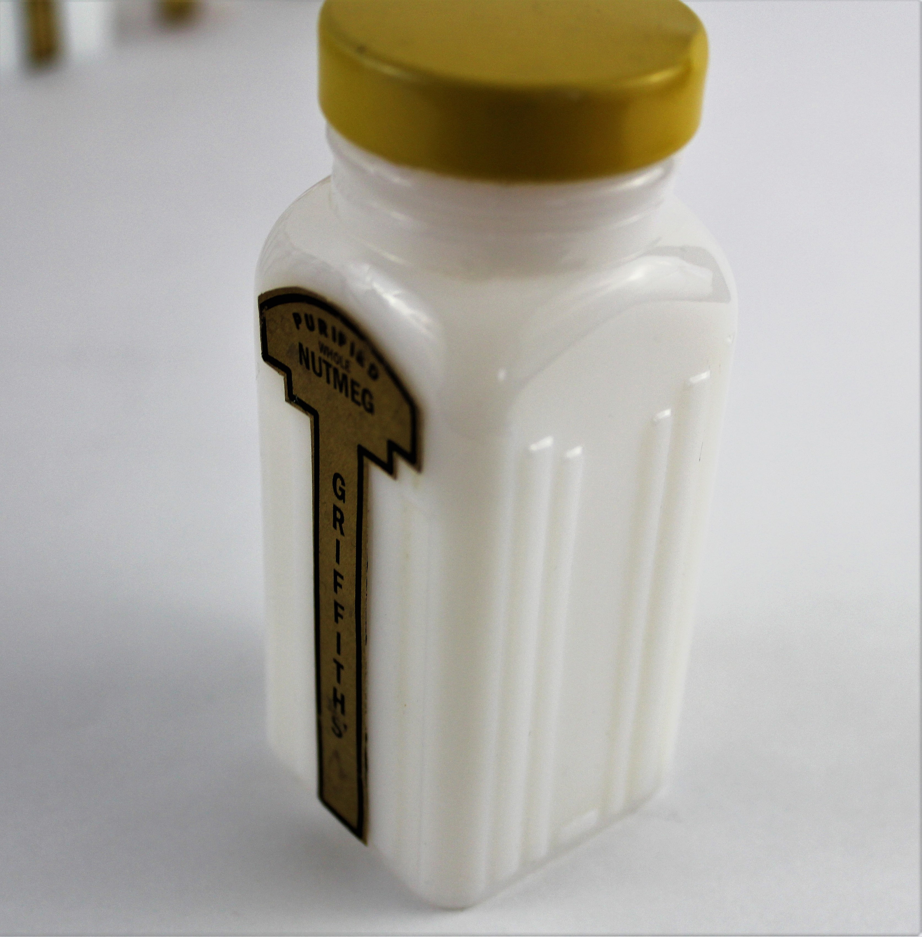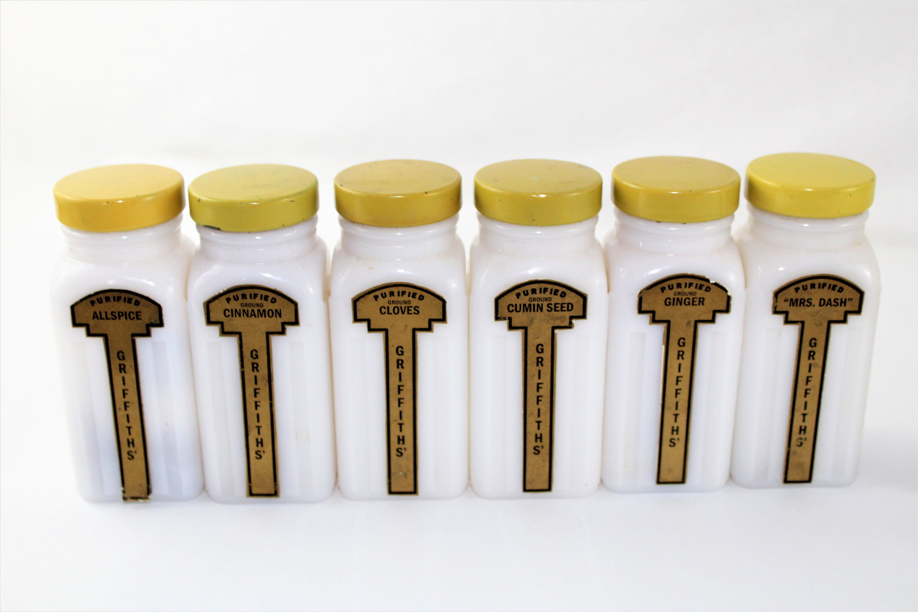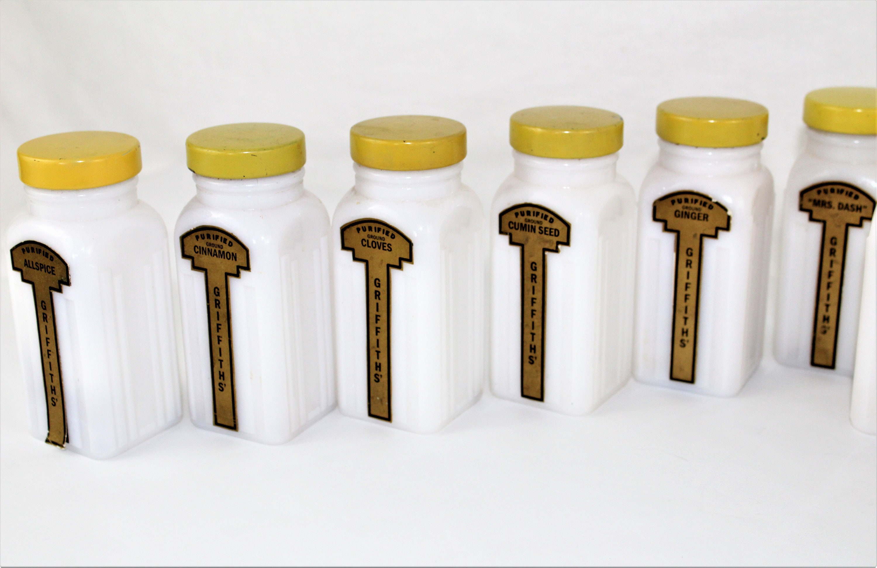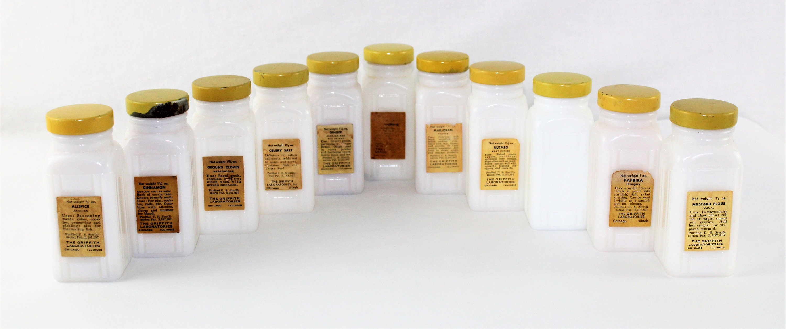 Wonderful original set of Griffith's Spice Jars made by the Griffith Laboratories Chicago Illinois. These spice jars where made from the 1930-1950s, made of milk glass with metal screw on lids. These are the original design of the jars with graduated raised columns on sides and back and inset pillars on the front.