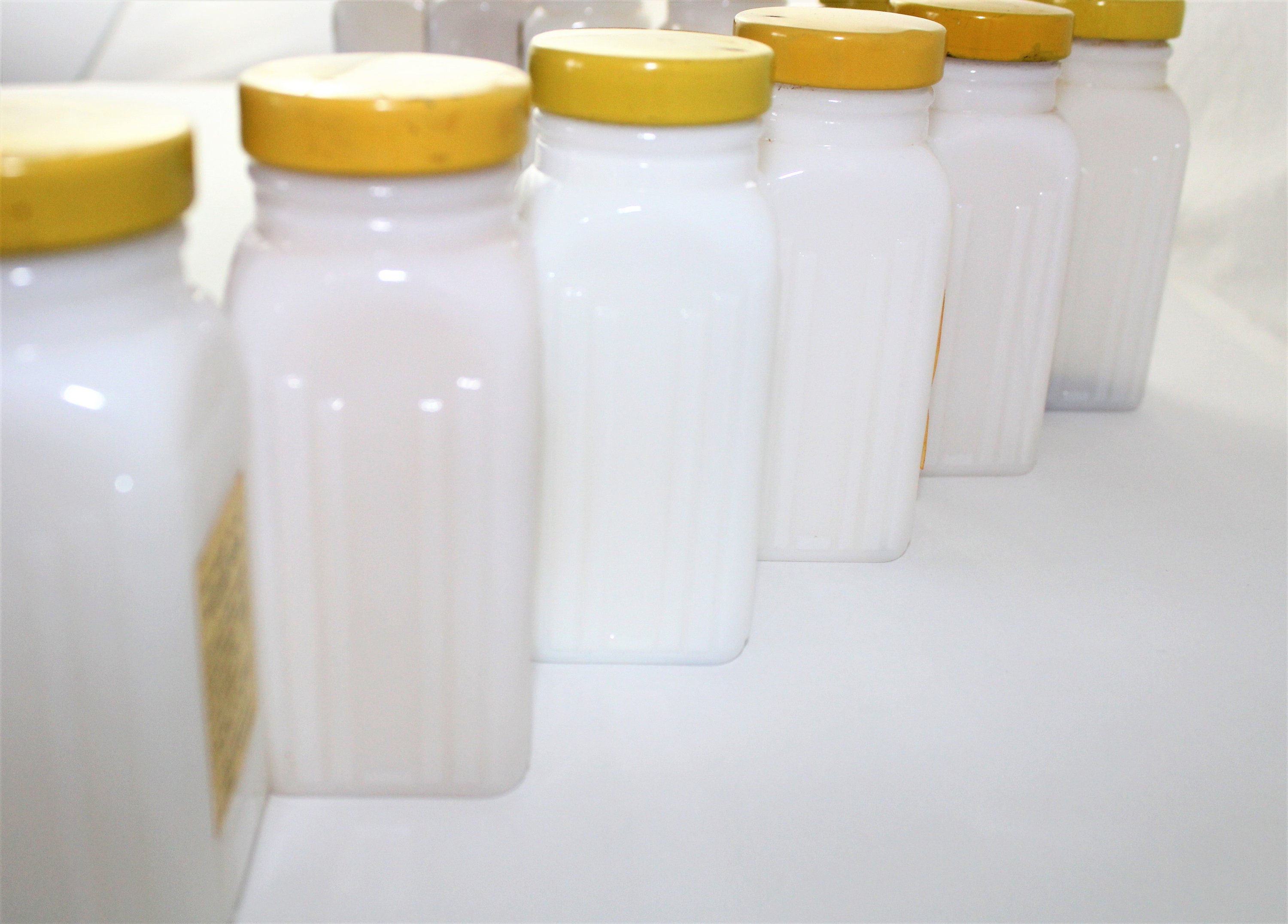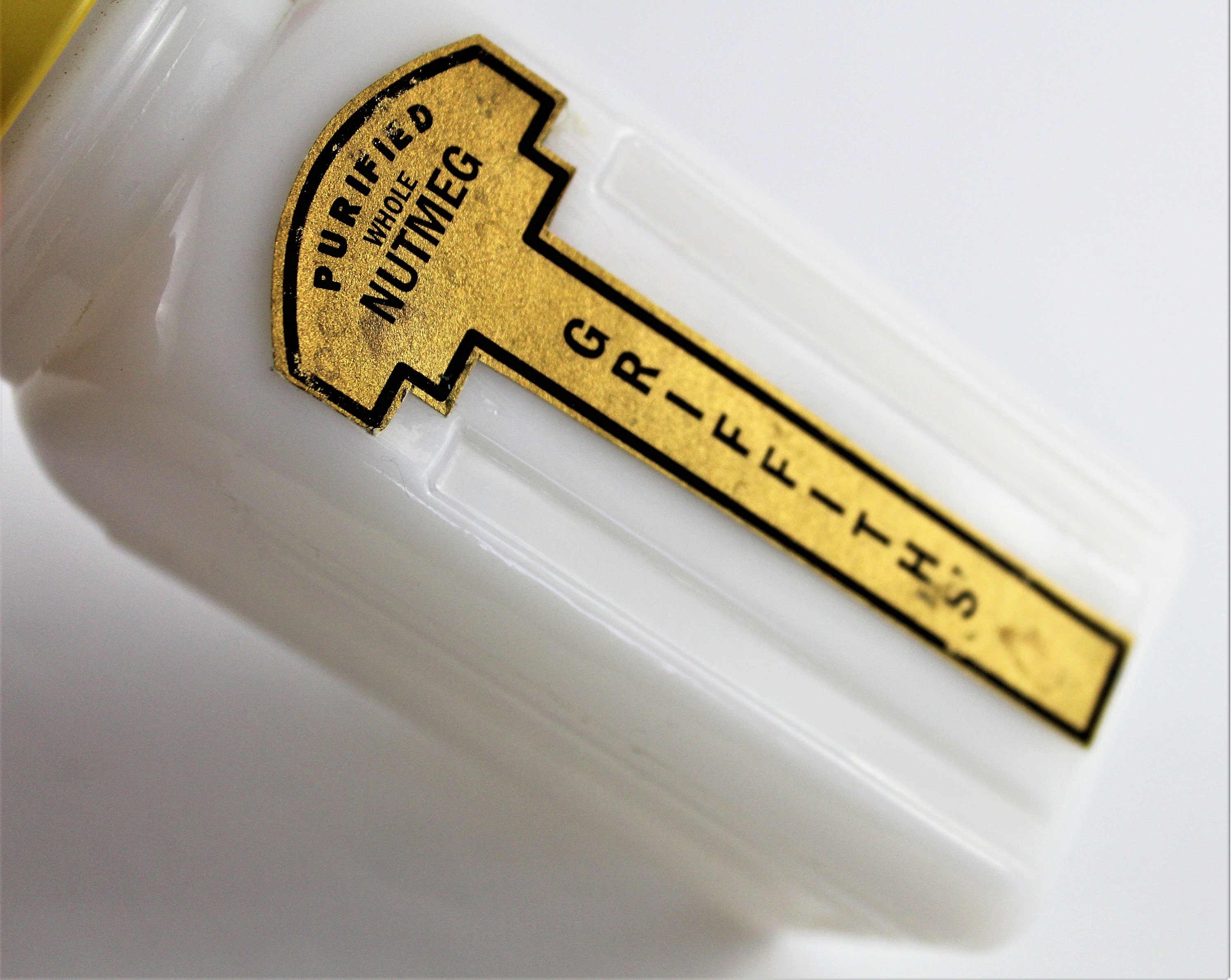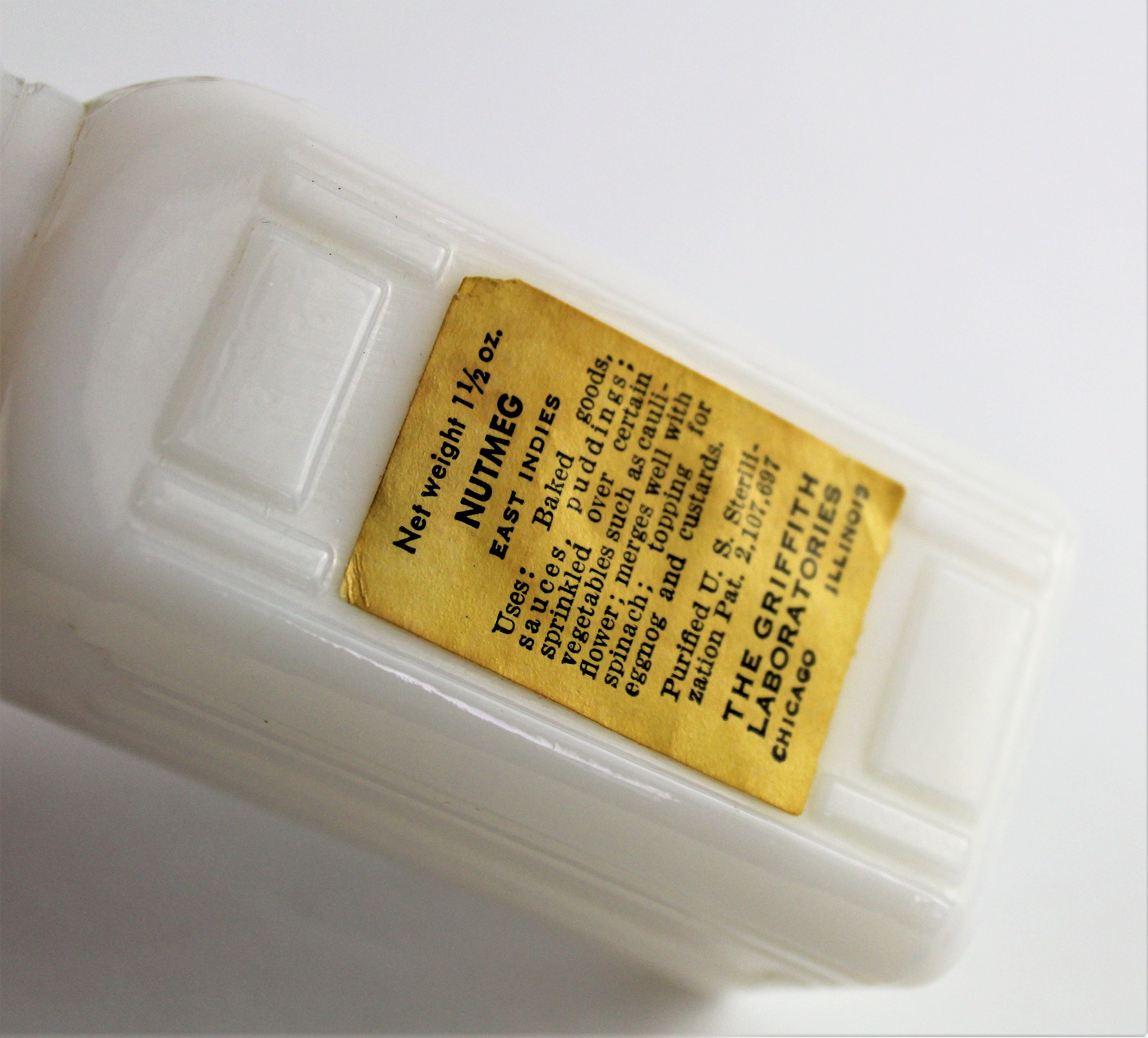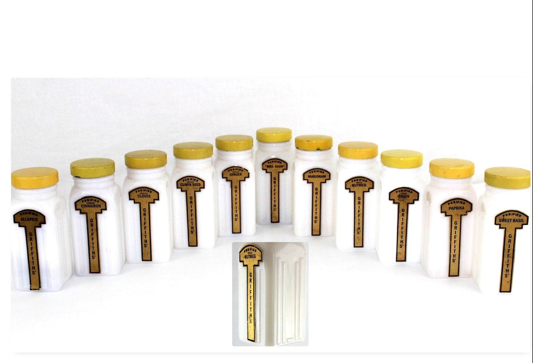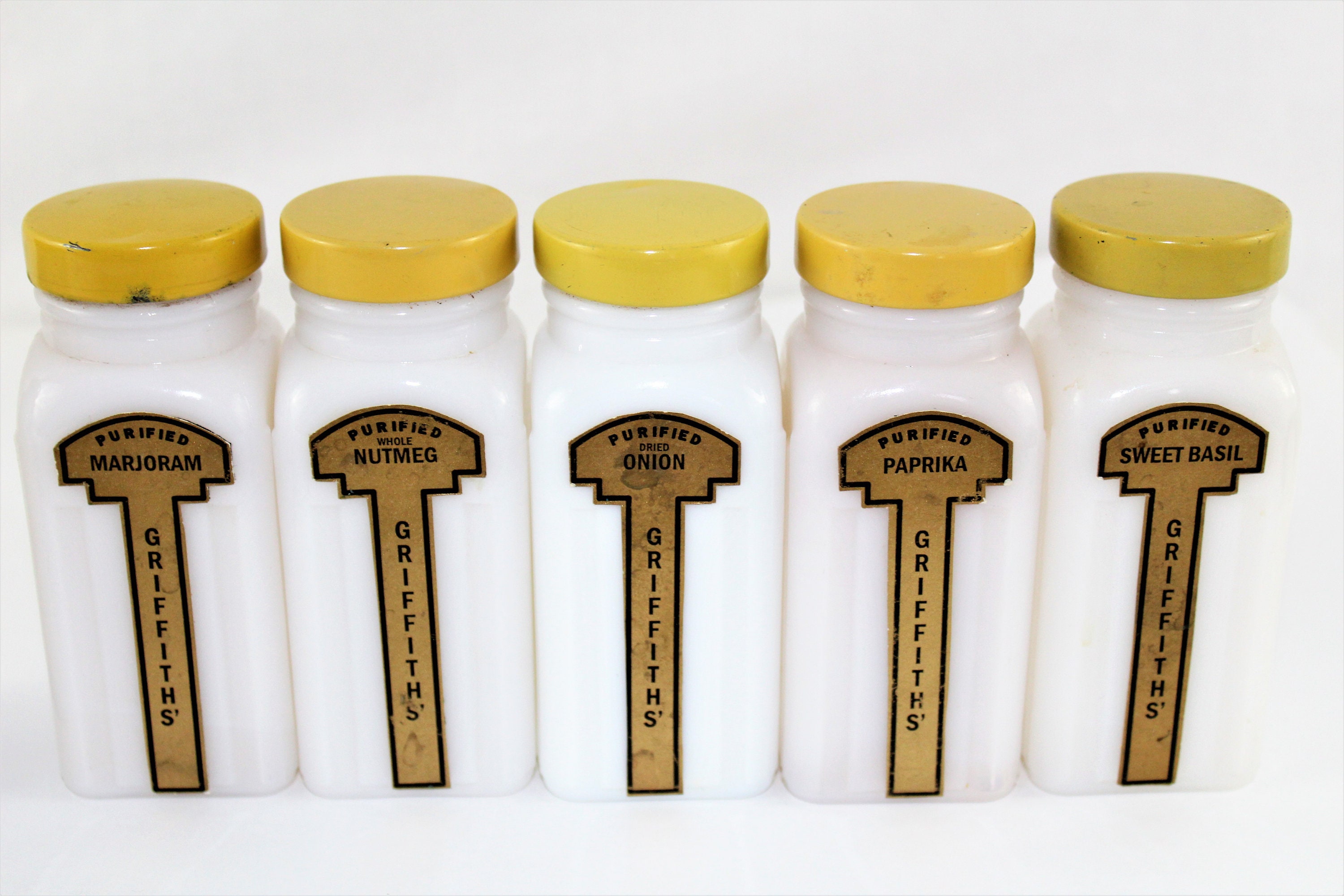 Wonderful original set of Griffith's Spice Jars made by the Griffith Laboratories Chicago Illinois. These spice jars where made from the 1930-1950s, made of milk glass with metal screw on lids. These are the original design of the jars with graduated raised columns on sides and back and inset pillars on the front.