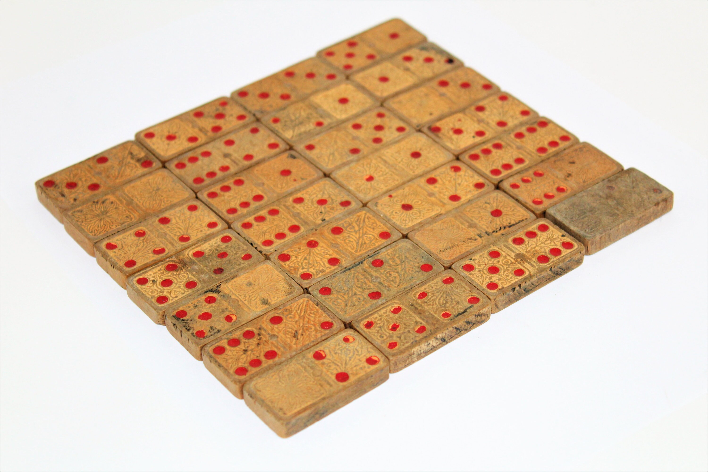 Wonderful full set of 28 antique wood dominoes. These are made of wood with decretive scroll design on both sides and red painted number spots. The box is not original to the set but is collectible also with four 1962 Lincoln postage stamps on the bottom of the box.