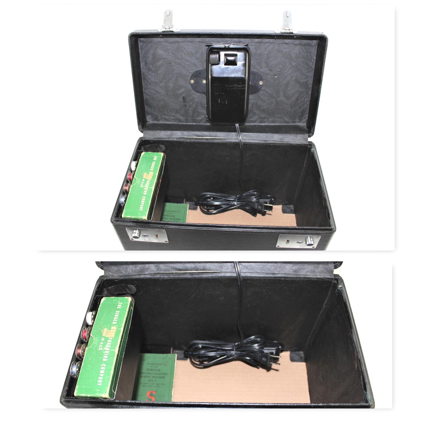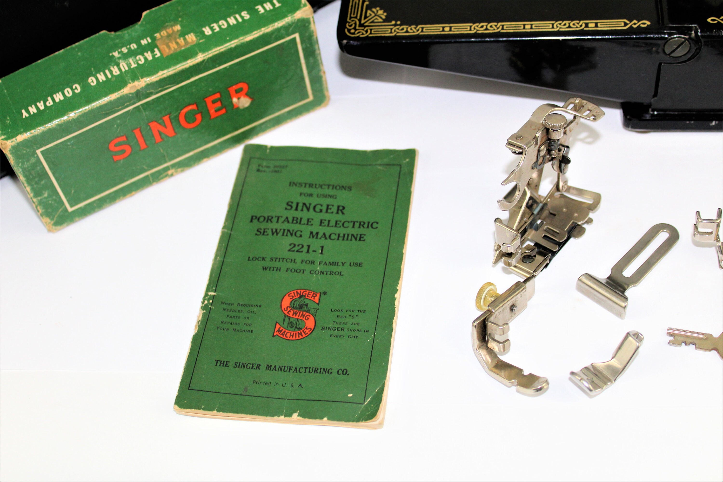 We have for sale a charming vintage Singer 221-1 portable featherweight sewing machine and carrying case. Serial # AL162462. The machine badge was issued on December 12, 1952 and was manufactured in Elizabethsport, NJ, USA. It has an original 110-volt motor and beautiful chrome trim. The machine and attachments are in excellent vintage condition. We’ve had several machines in the last few years and this one hums.