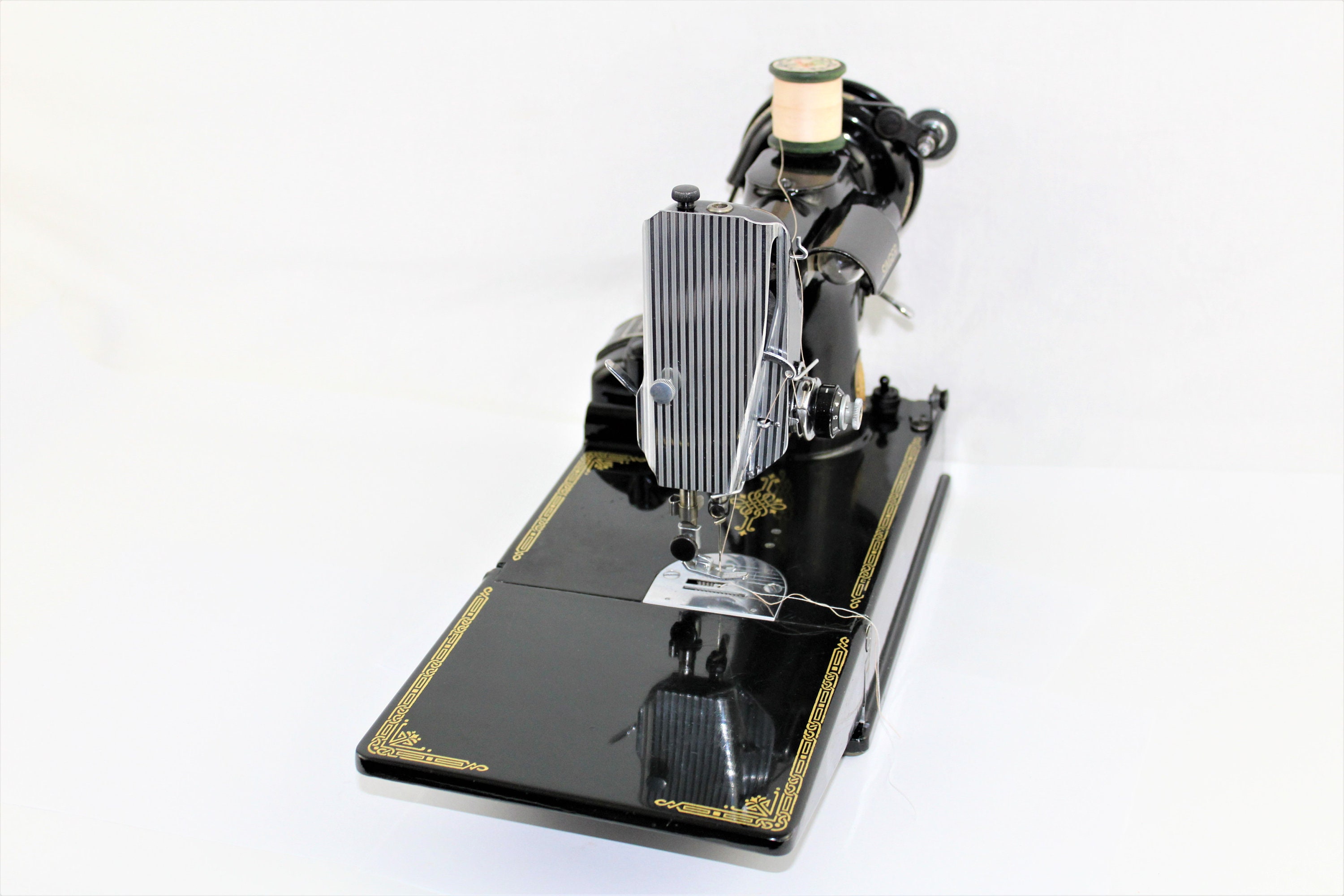 This is a very nice machine finished in that classic deep gorgeous shiny black featherweight paint, gold decals and chrome trim that shows minimal wear.