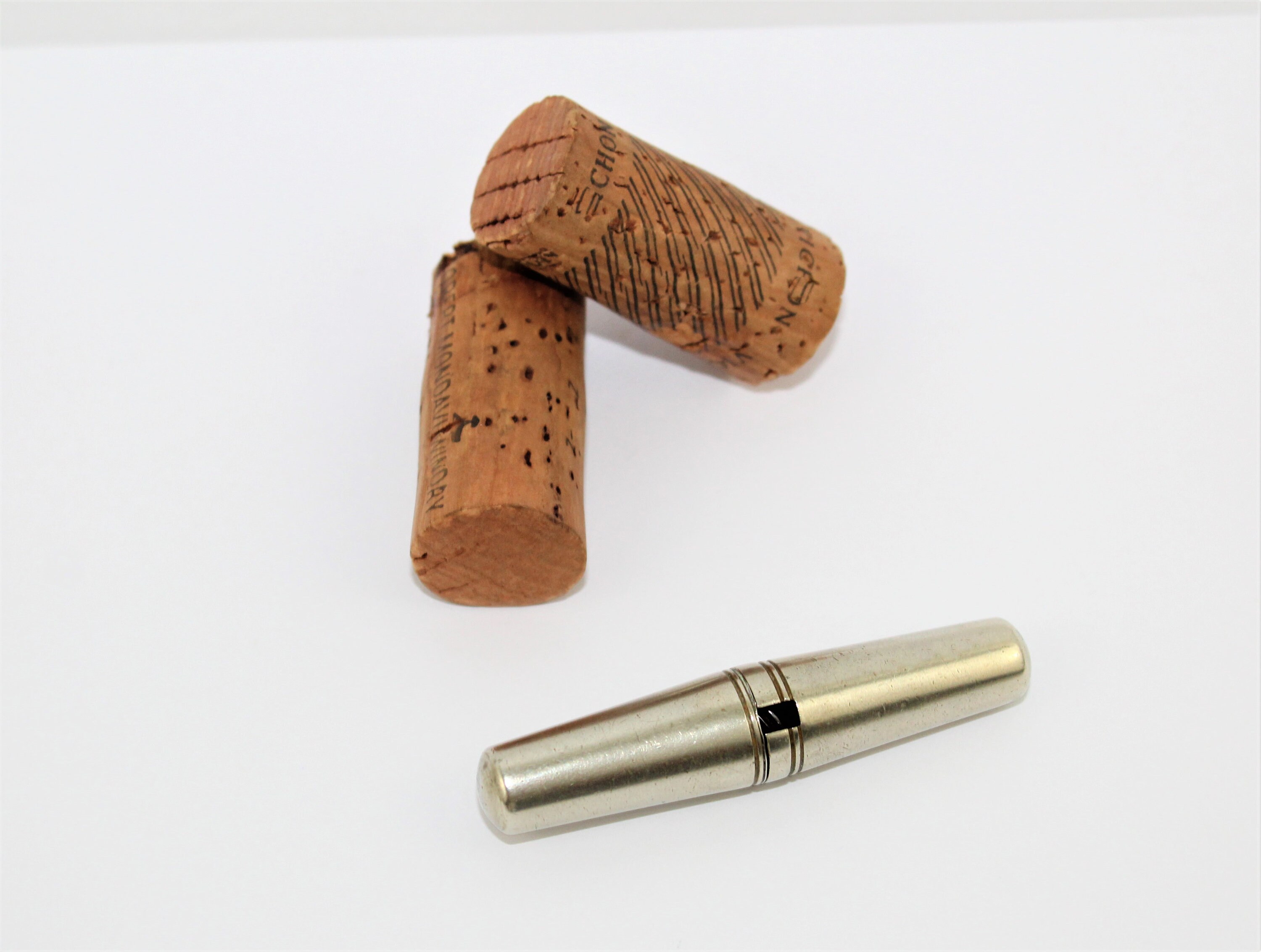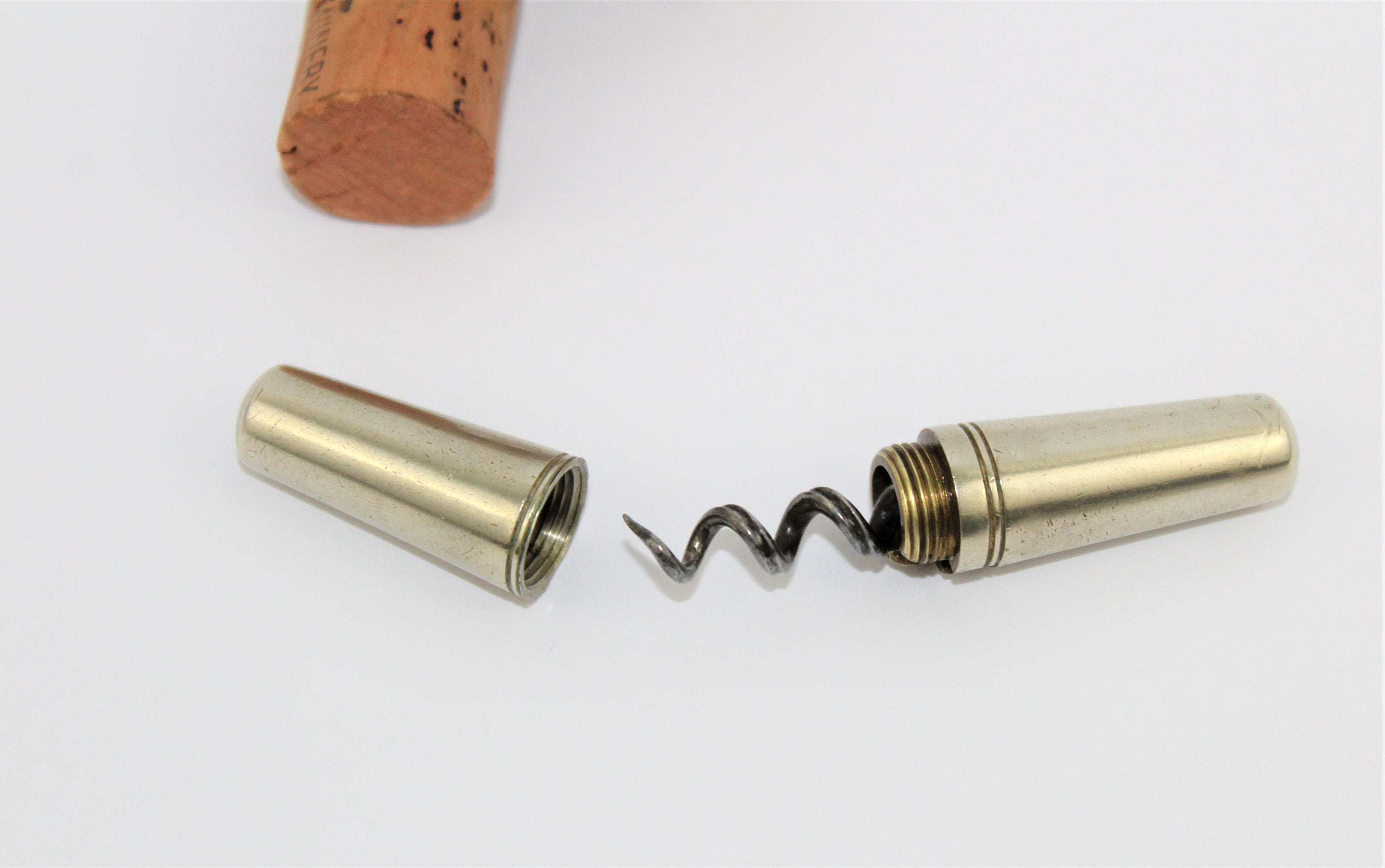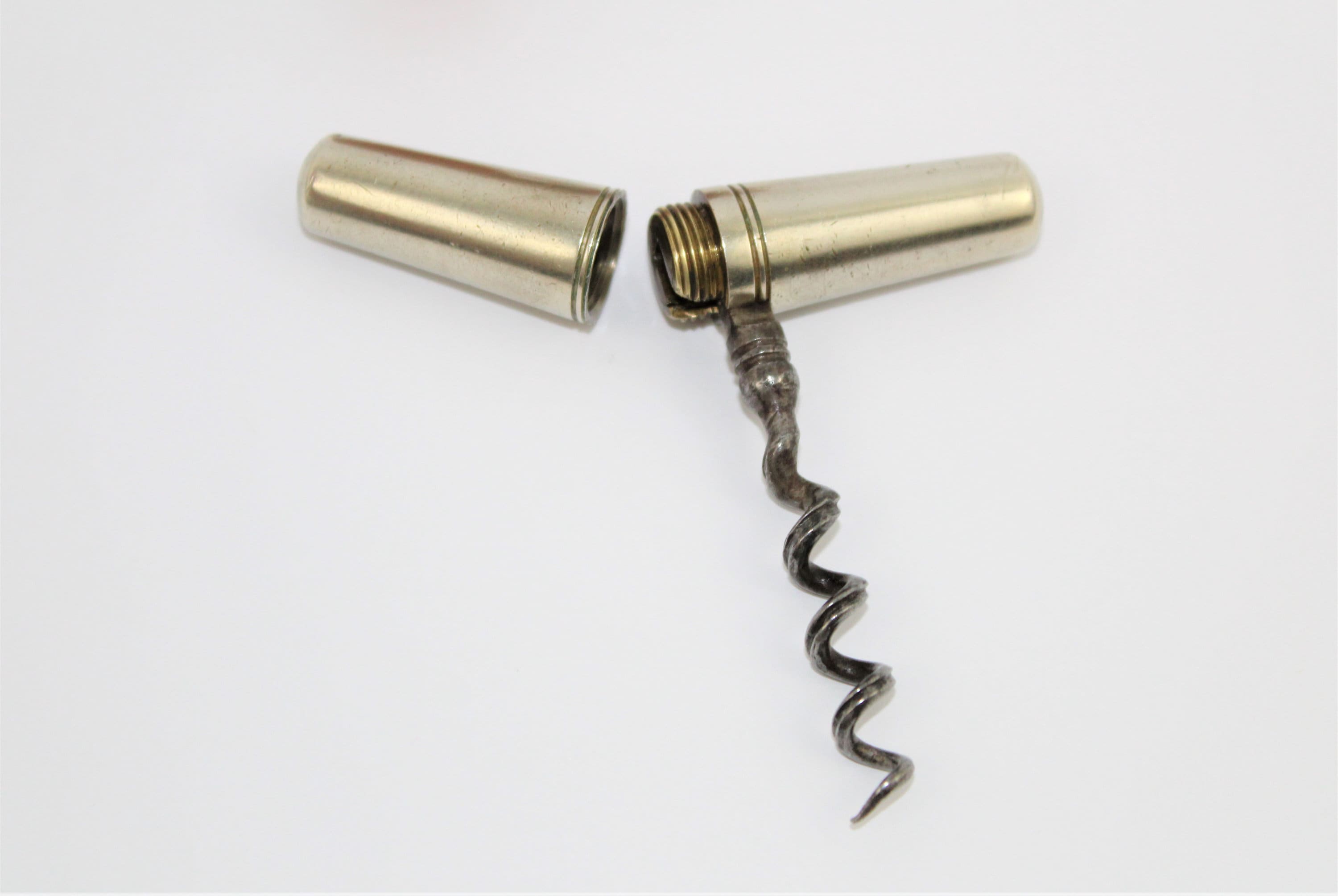 Wonderful antique travel size corkscrew. Known as a roundlet style corkscrew this lovely piece it is designed to travel in one’s pocket or bag. Made of beautiful nickel-plated brass, unscrew the case and slide out the fluted worm (screw) and screw the case back together to form the handle.