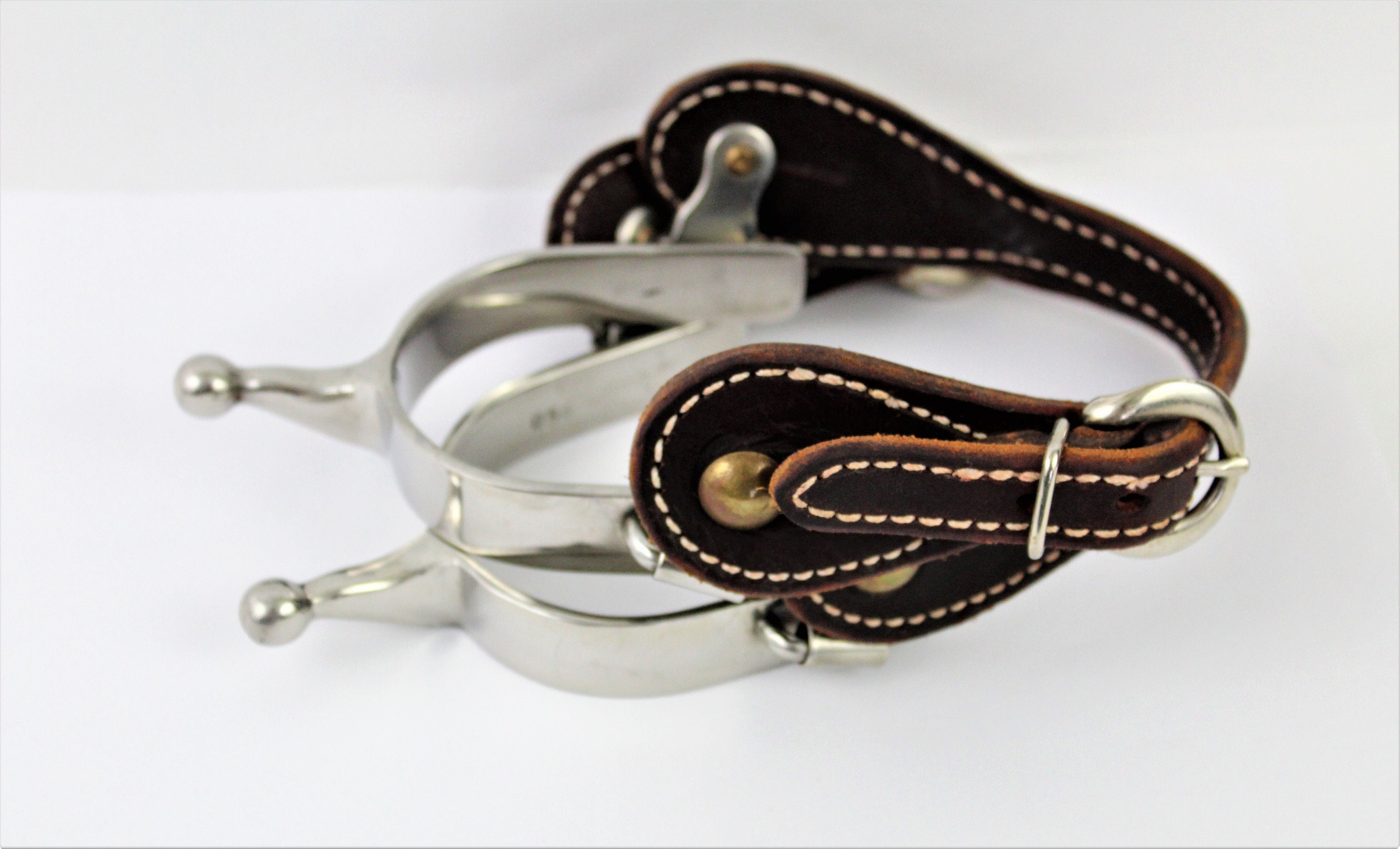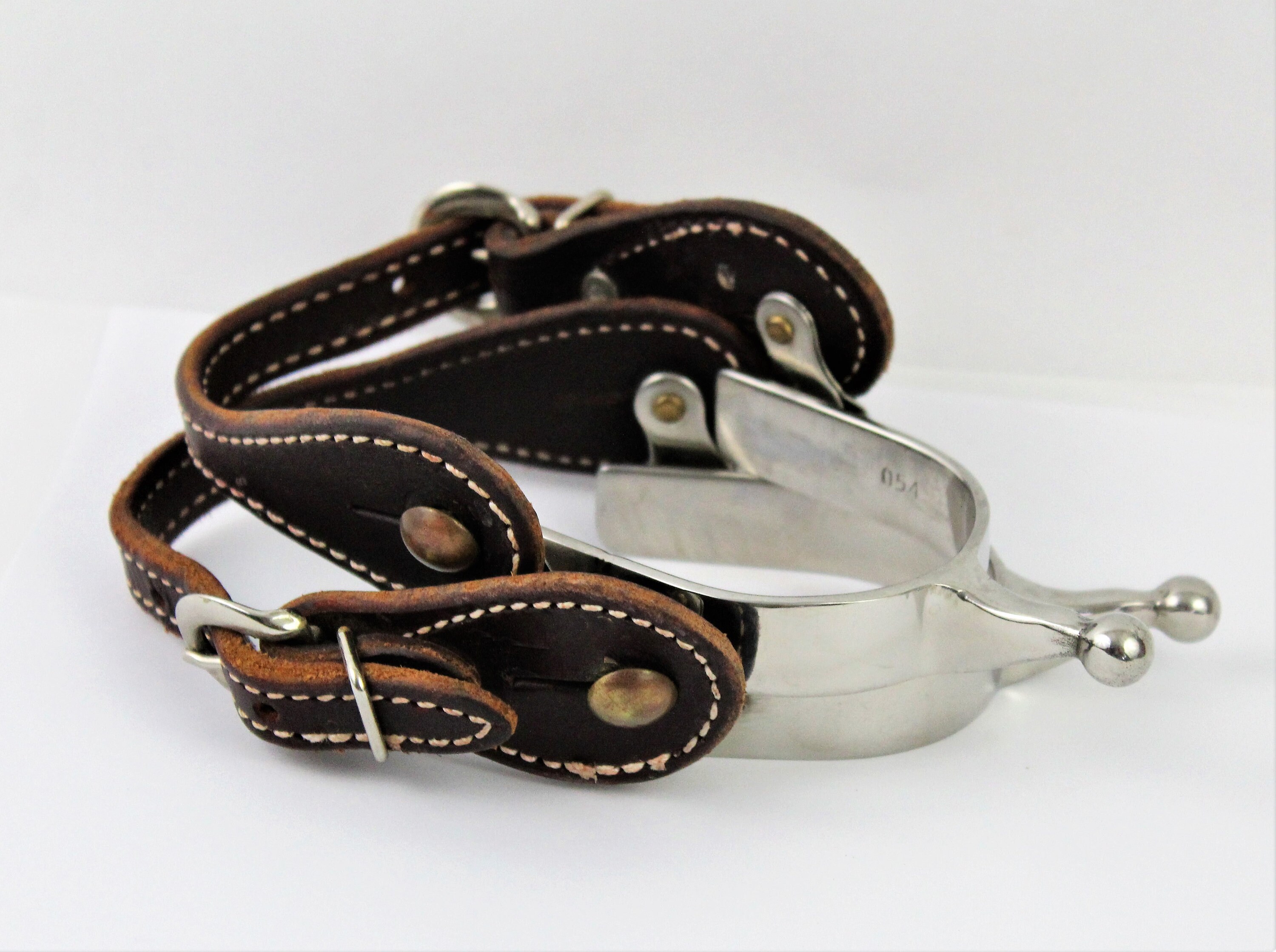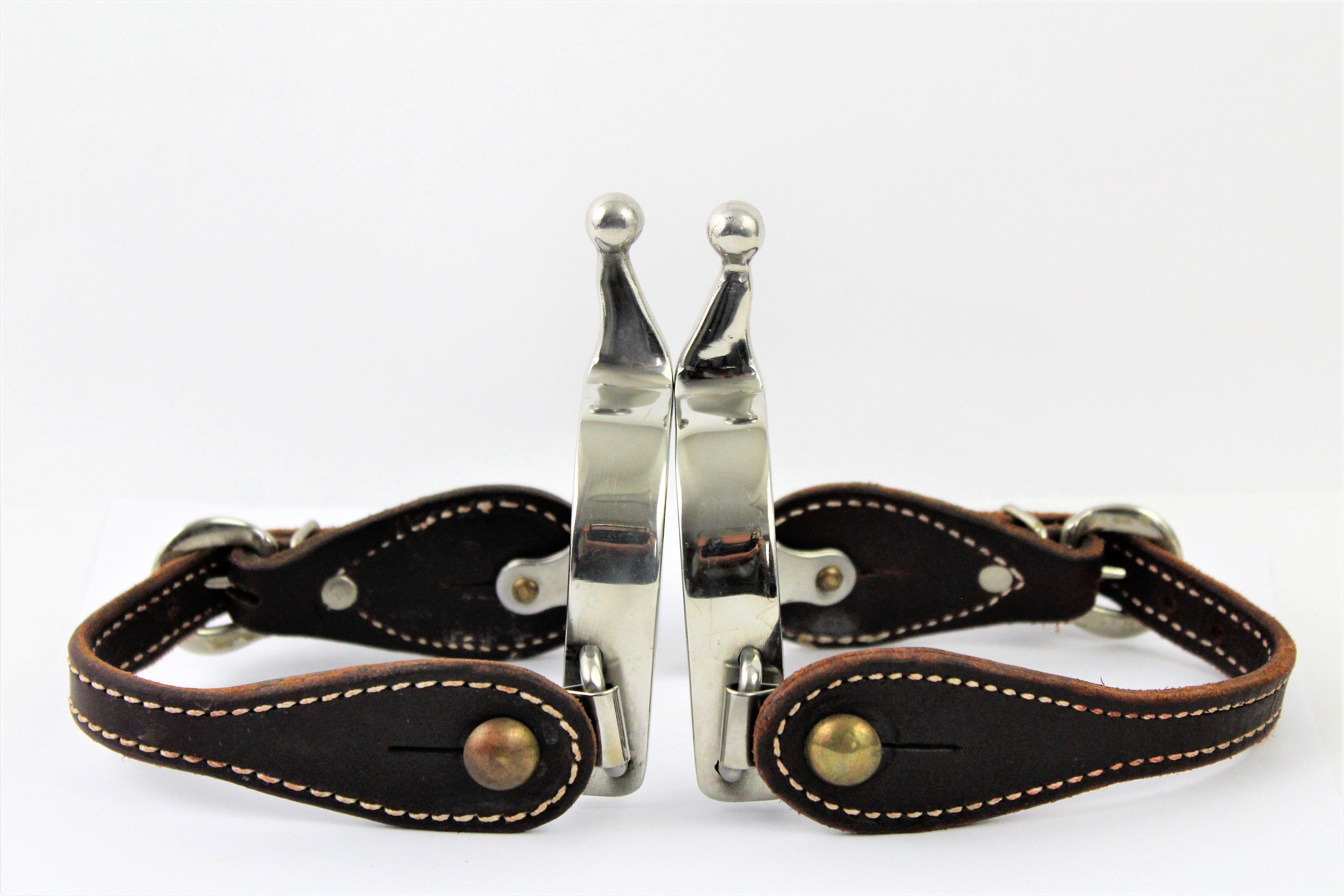 Wonderful western spurs known as Ball Spurs. The spurs are chrome plated steel with beautiful heavy leather straps. The spurs are chrome plated steel with brass buttons attaching the leather spur straps.