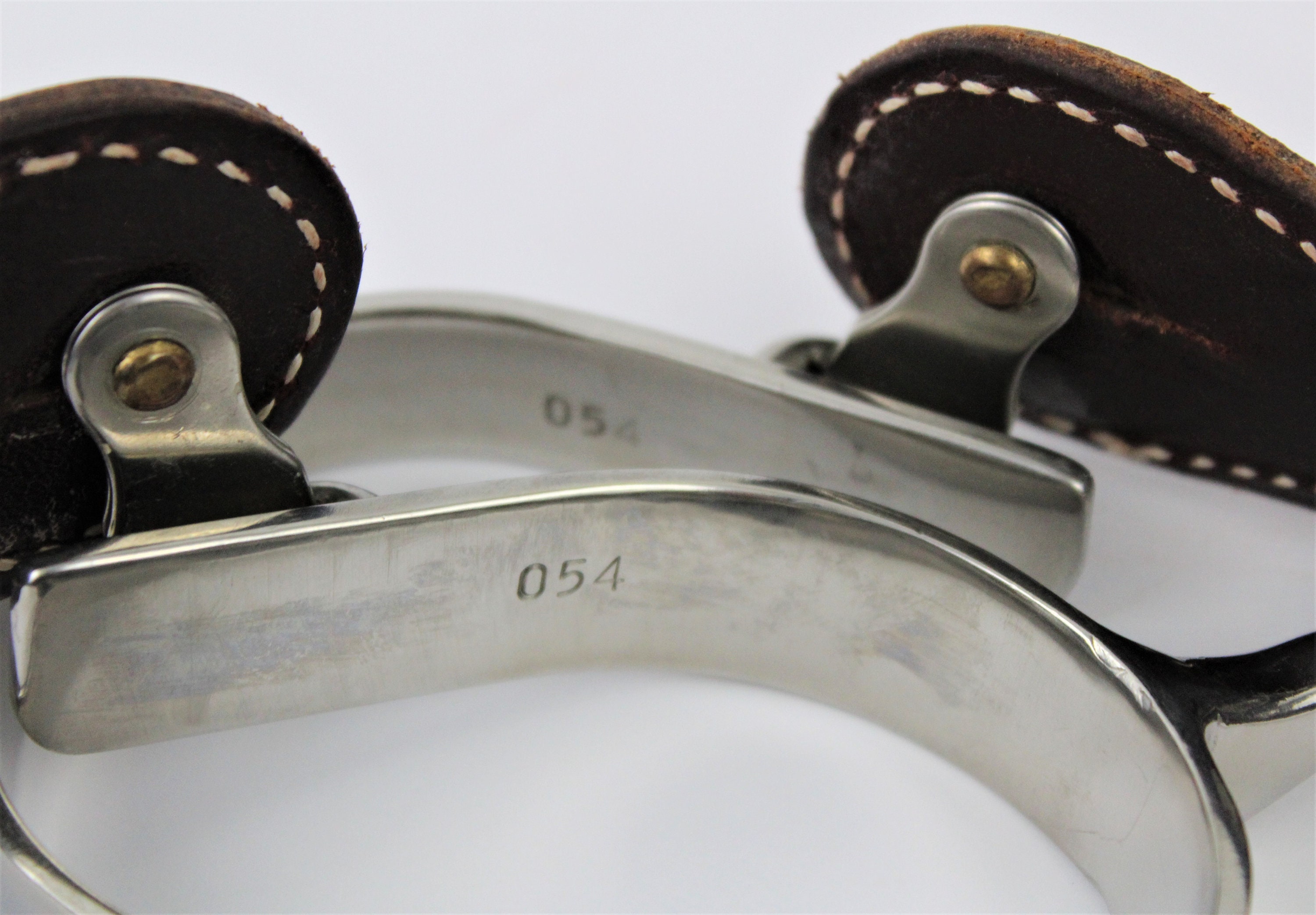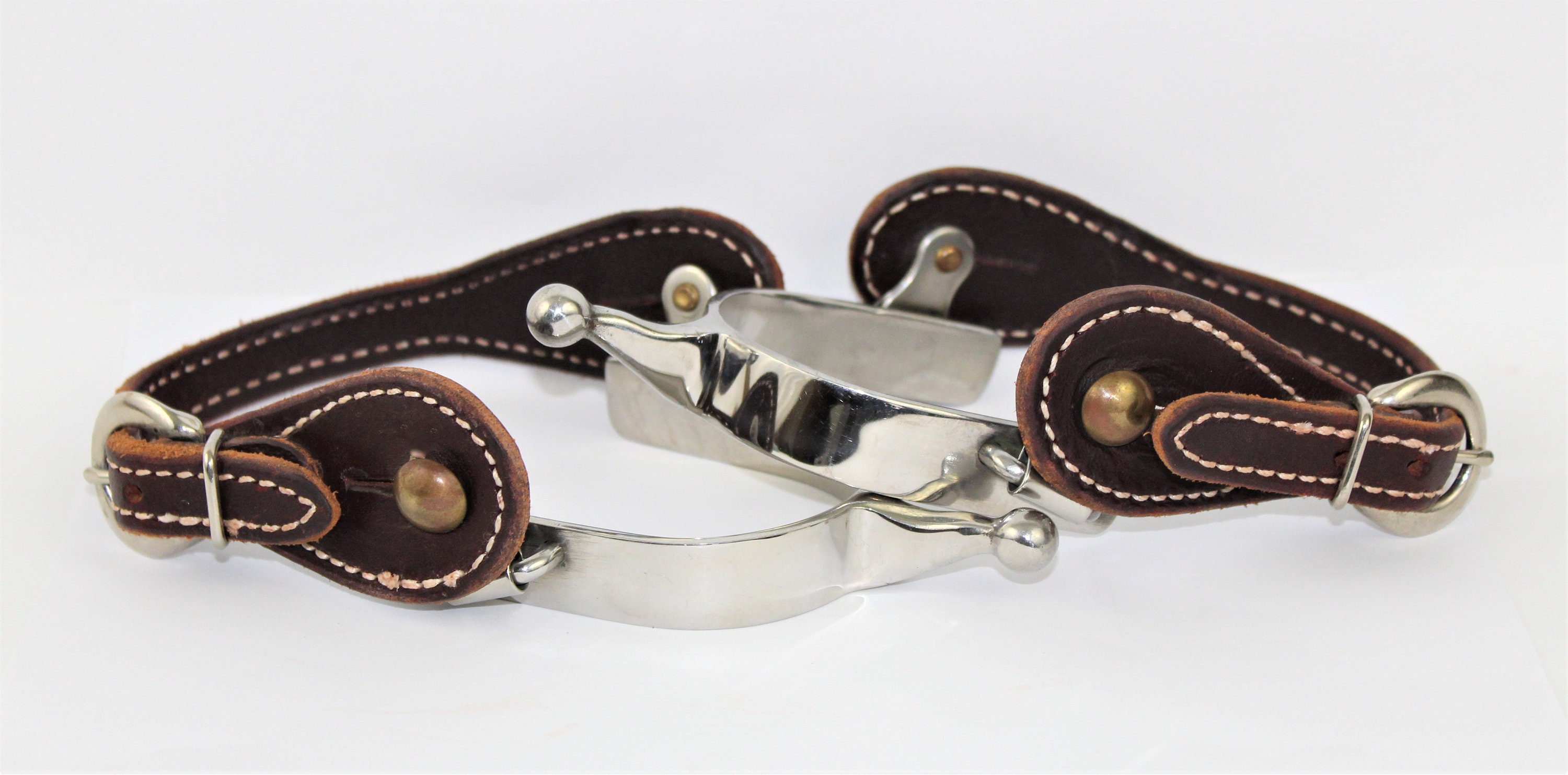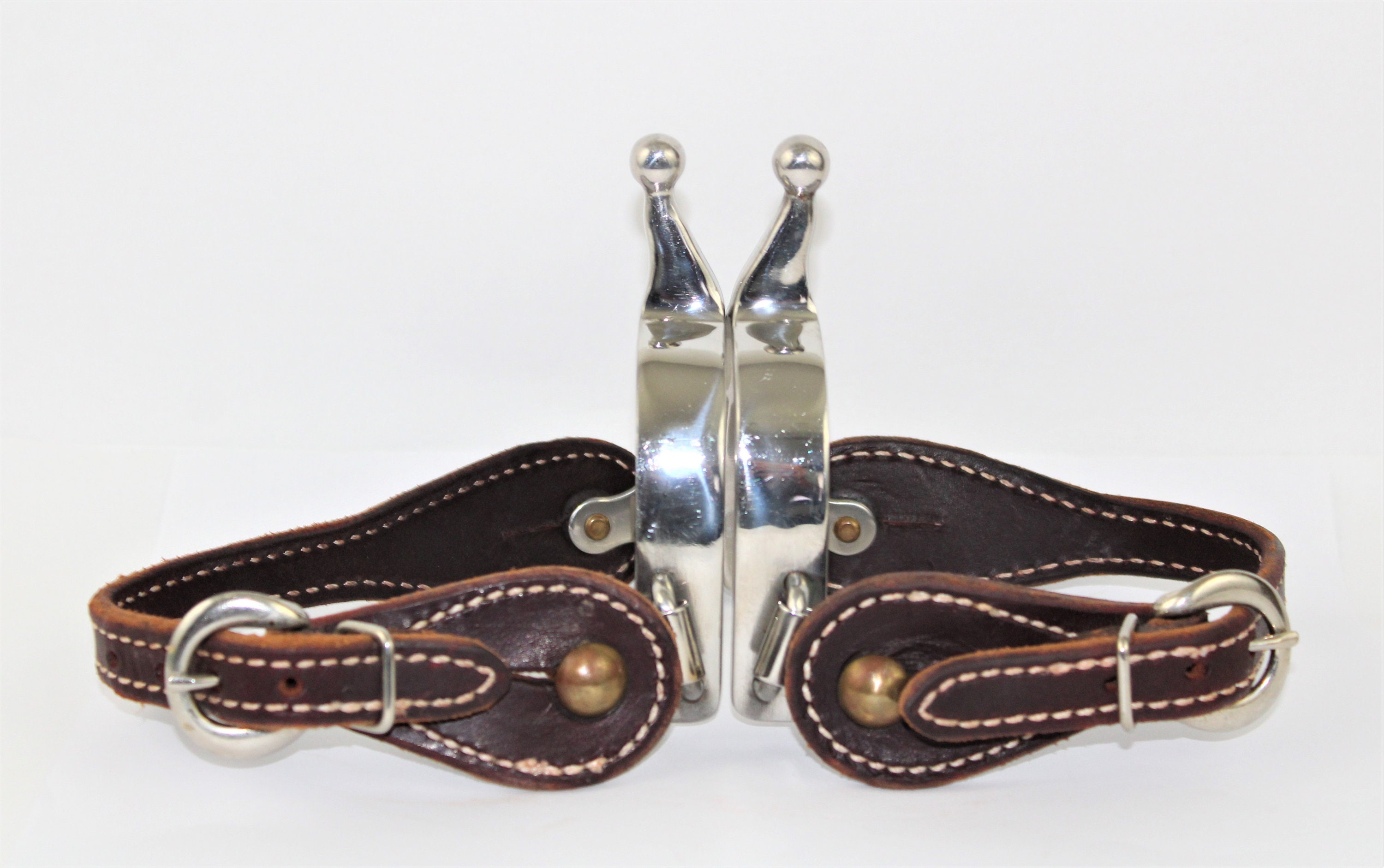 Wonderful western spurs known as Ball Spurs. The spurs are chrome plated steel with beautiful heavy leather straps. The spurs are chrome plated steel with brass buttons attaching the leather spur straps.