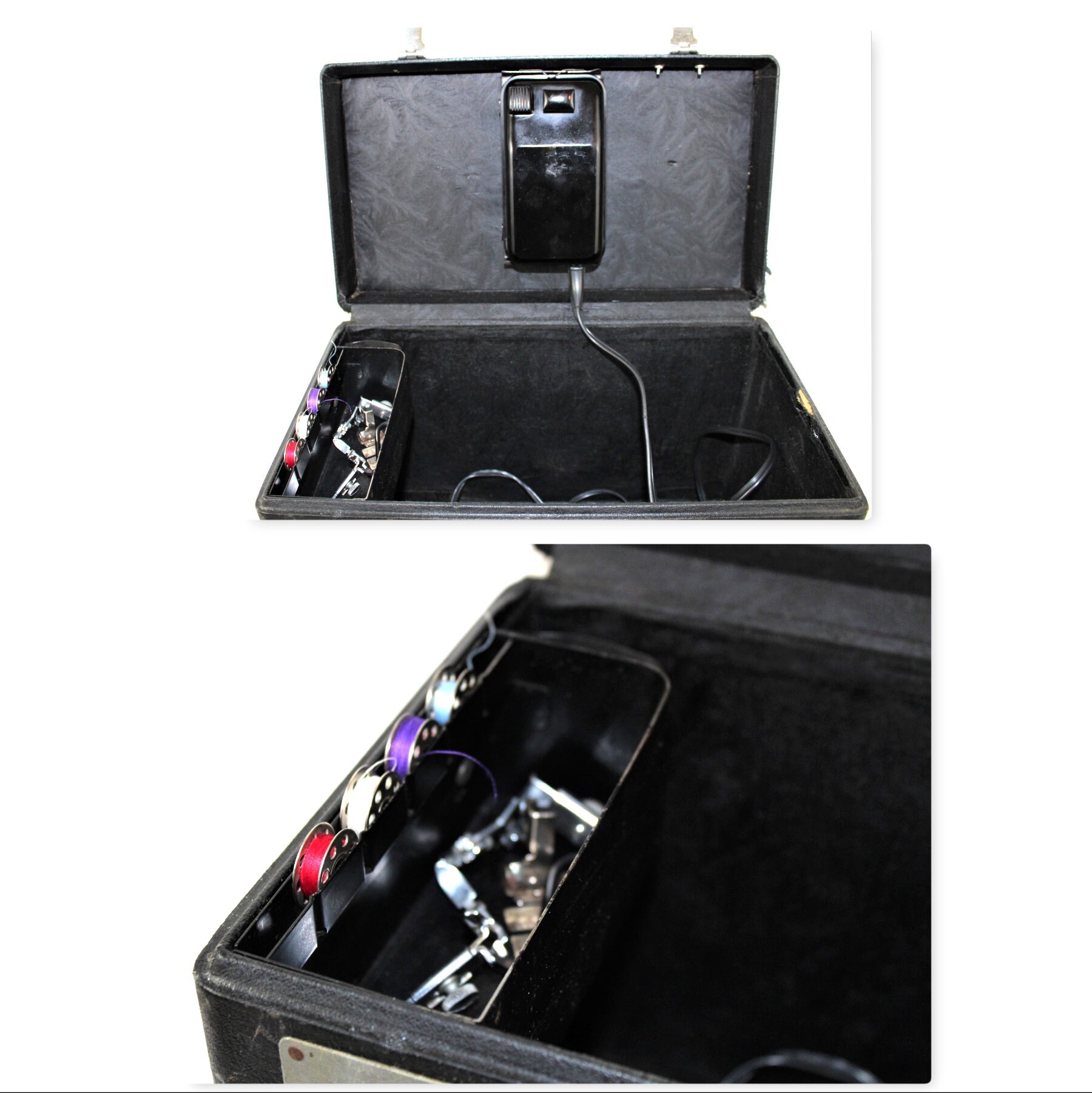 This is a very nice machine finished in that classic deep gorgeous shiny black featherweight paint, gold decals and chrome trim that shows minimal wear. The original foot pedal and electrical cord still makes the motor hum. The carrying case is also in fair nice condition with original hardware, handle. Please see all photos as they are part of the item’s description.