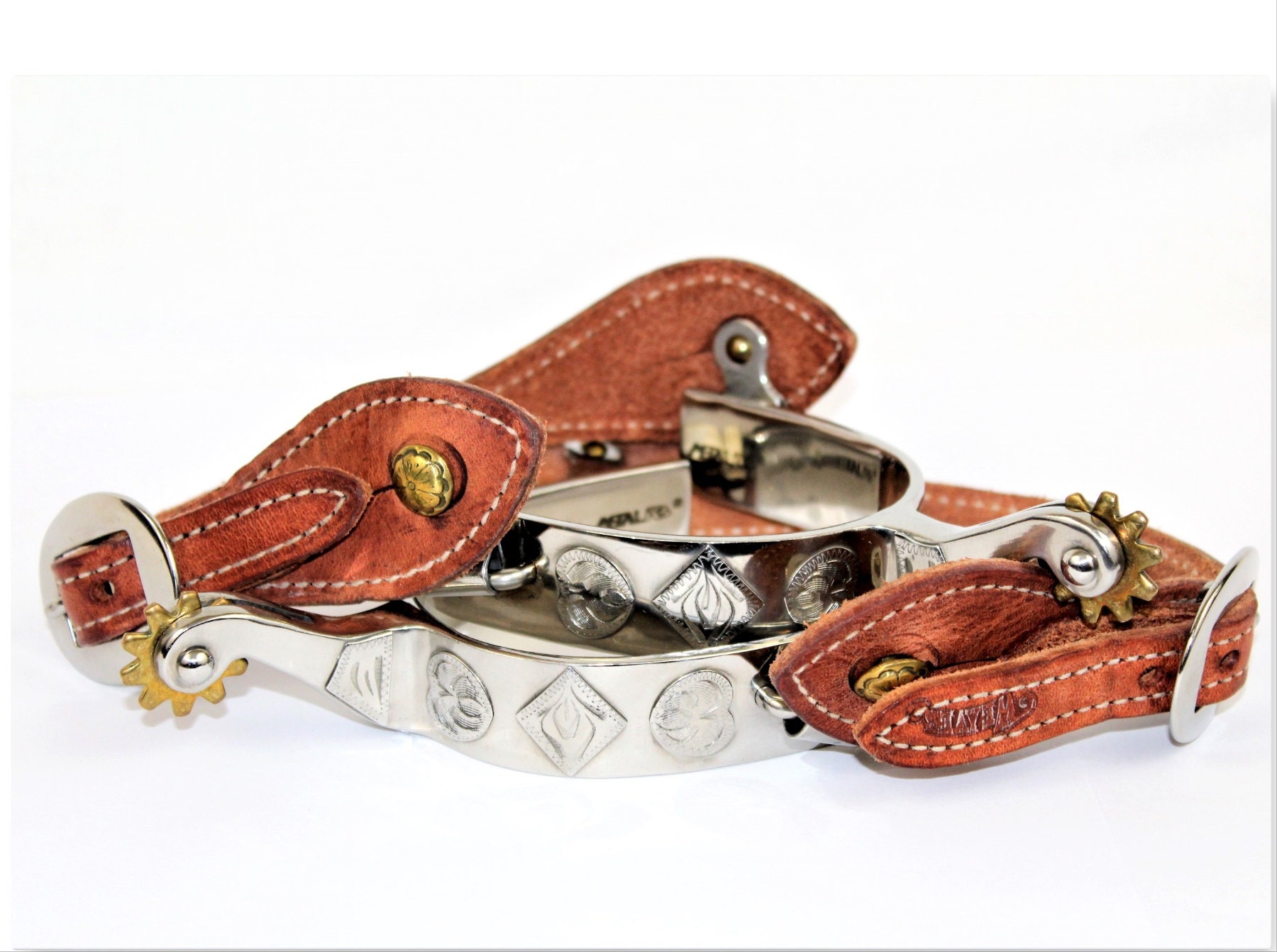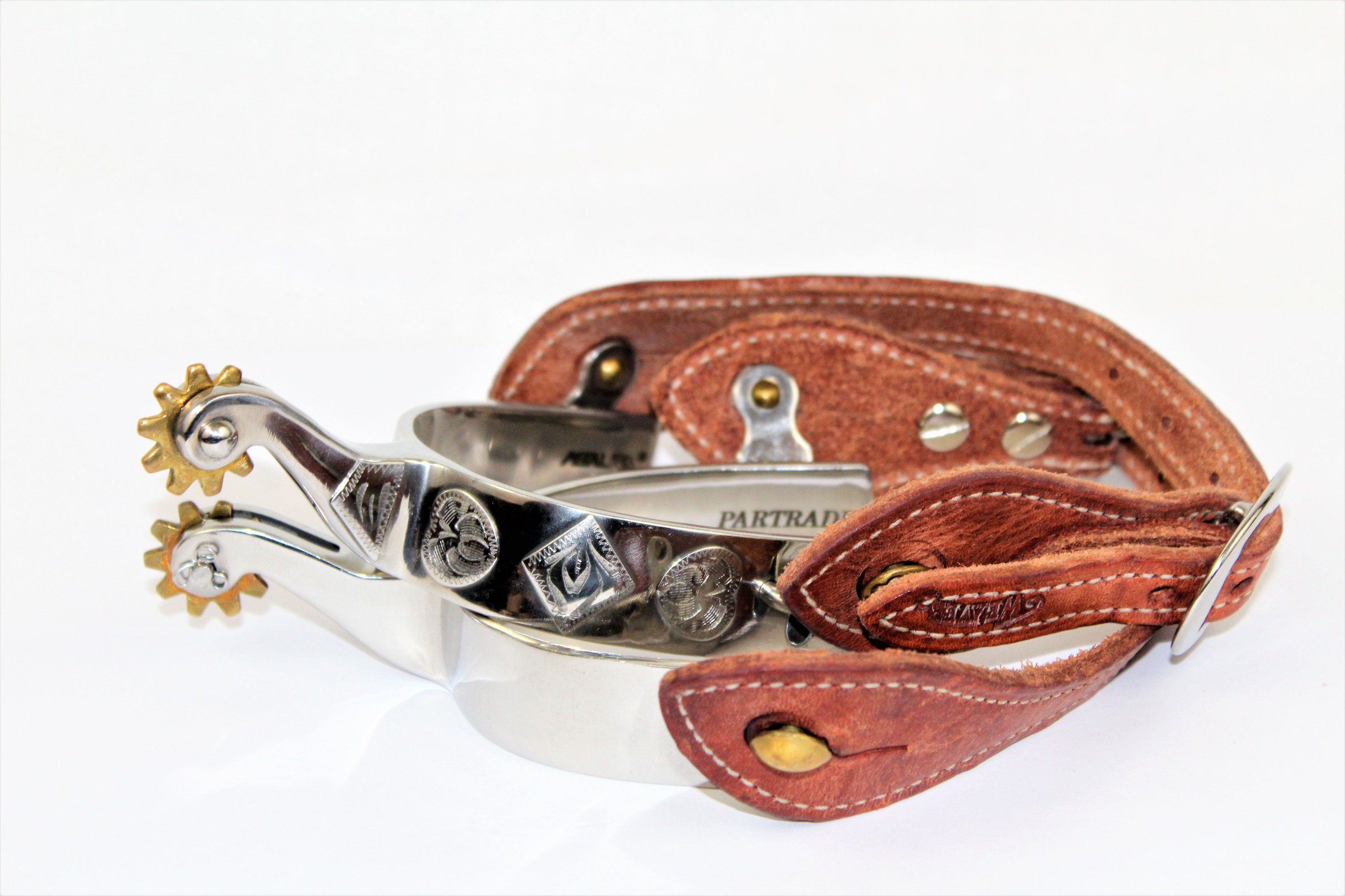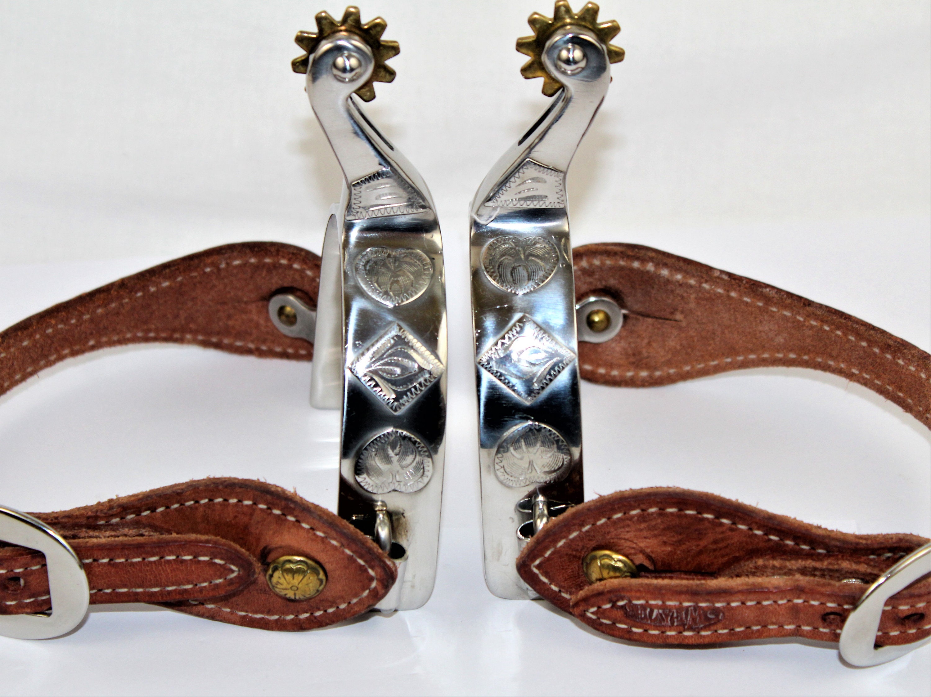 Wonderful decorative Western Spurs with ten-point brass rowels. The Heelband and shank have silver overlay designs of harts and diamonds.