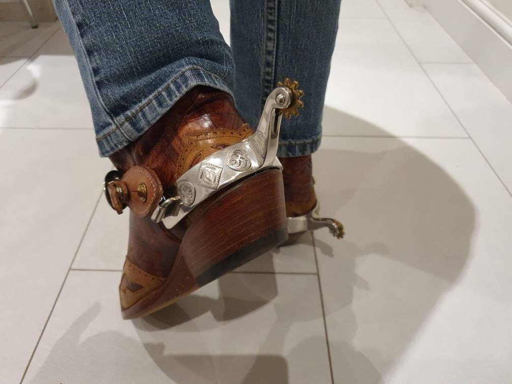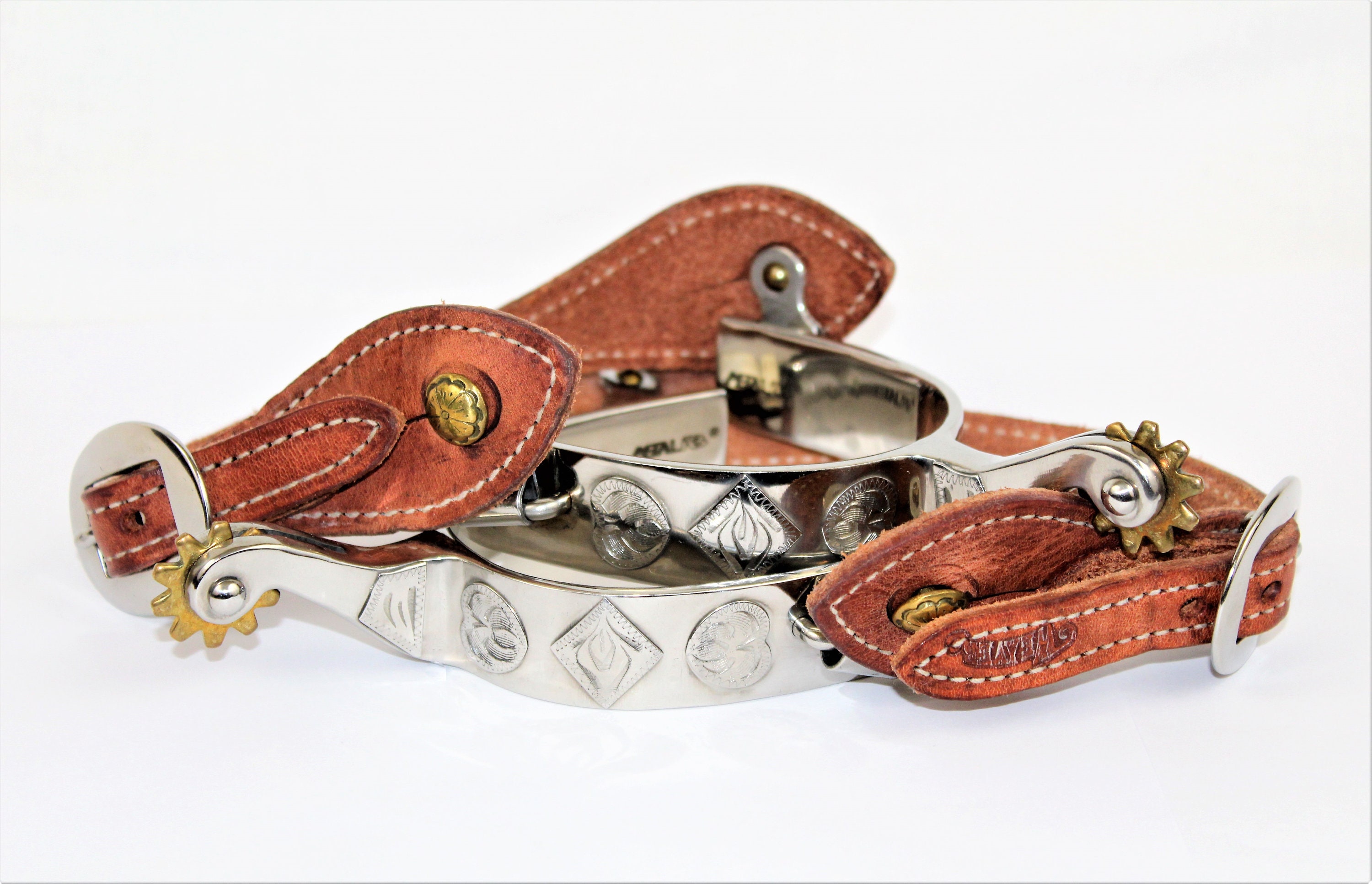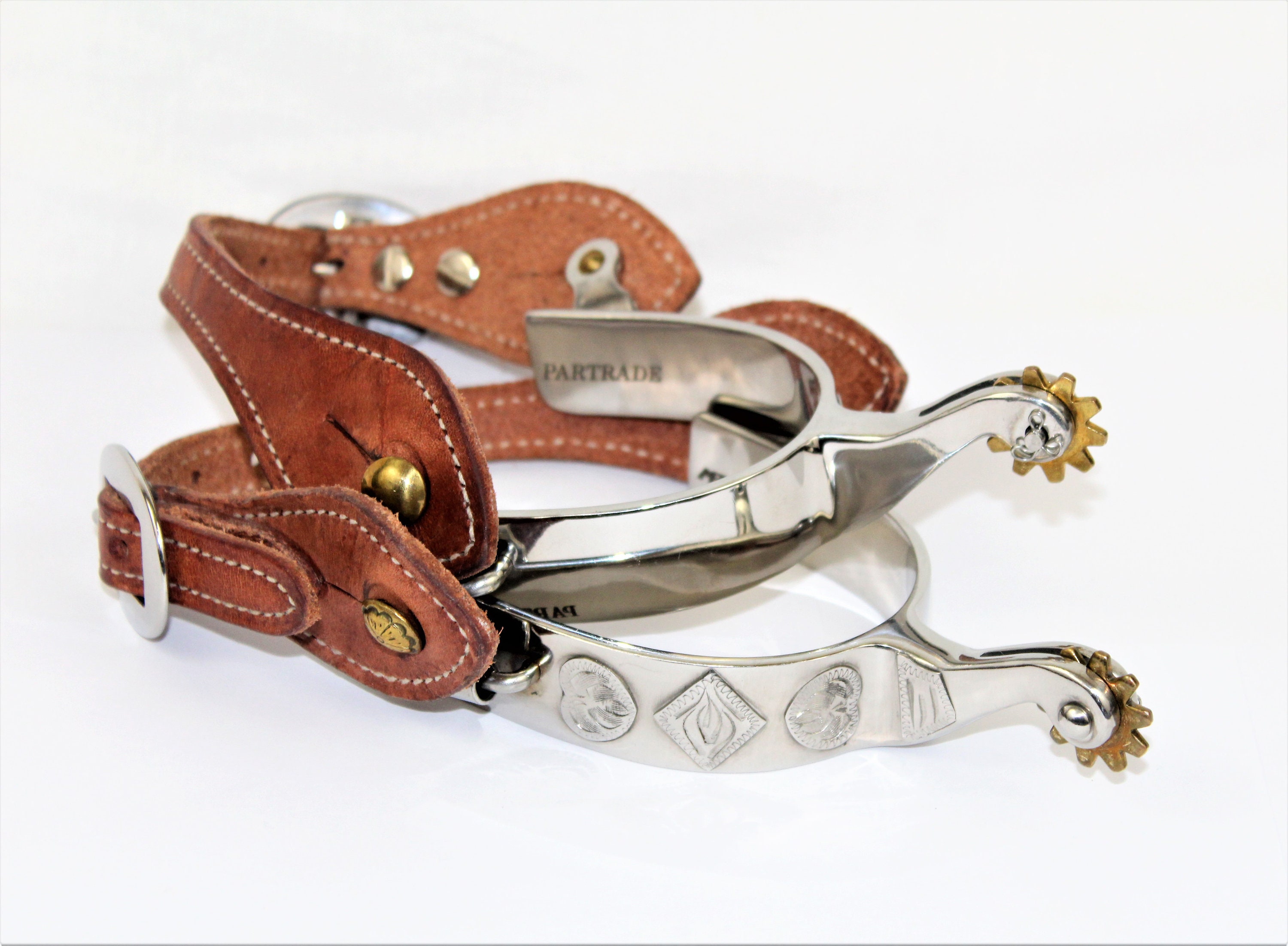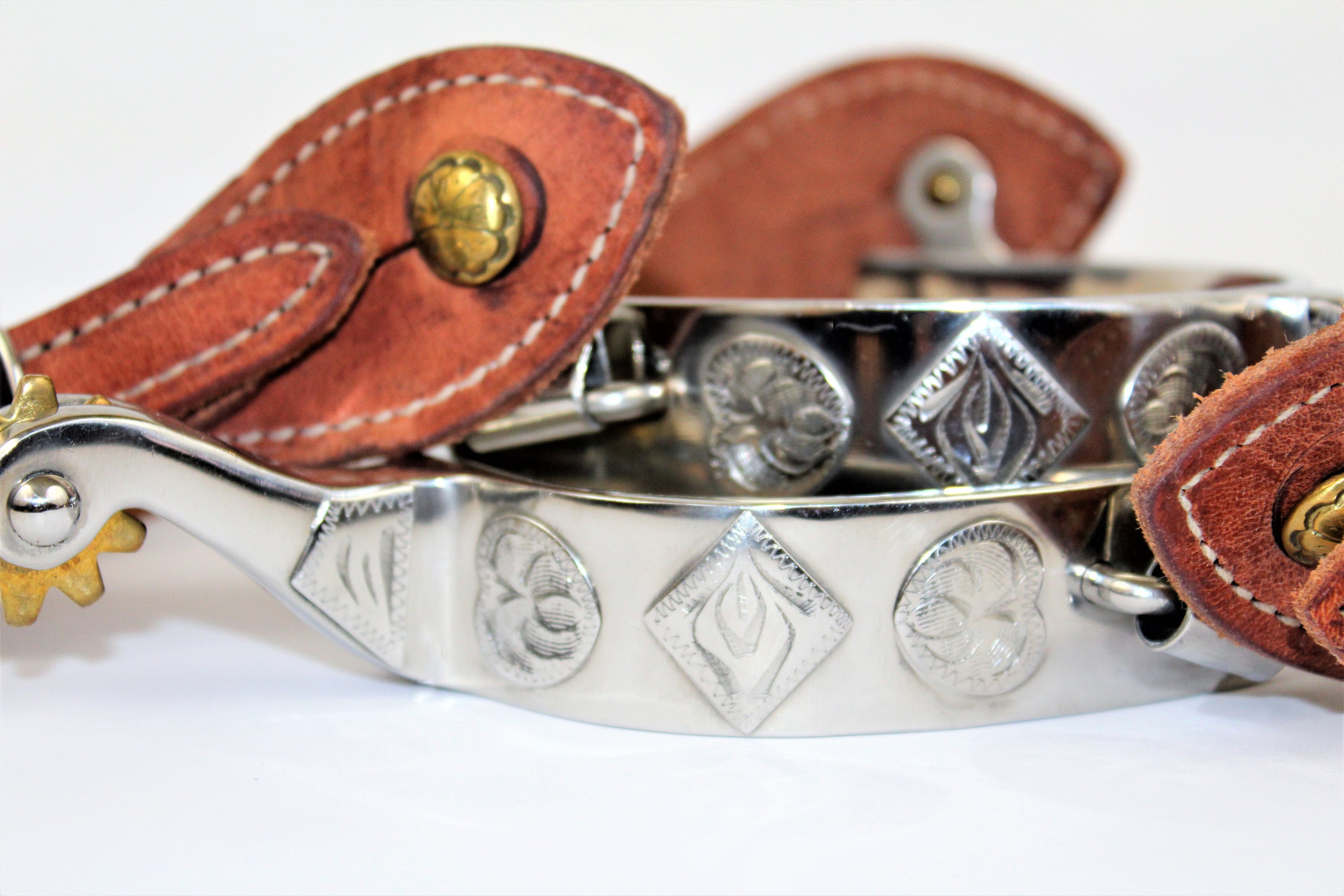 Wonderful decorative Western Spurs with ten-point brass rowels. The Heelband and shank have silver overlay designs of harts and diamonds.