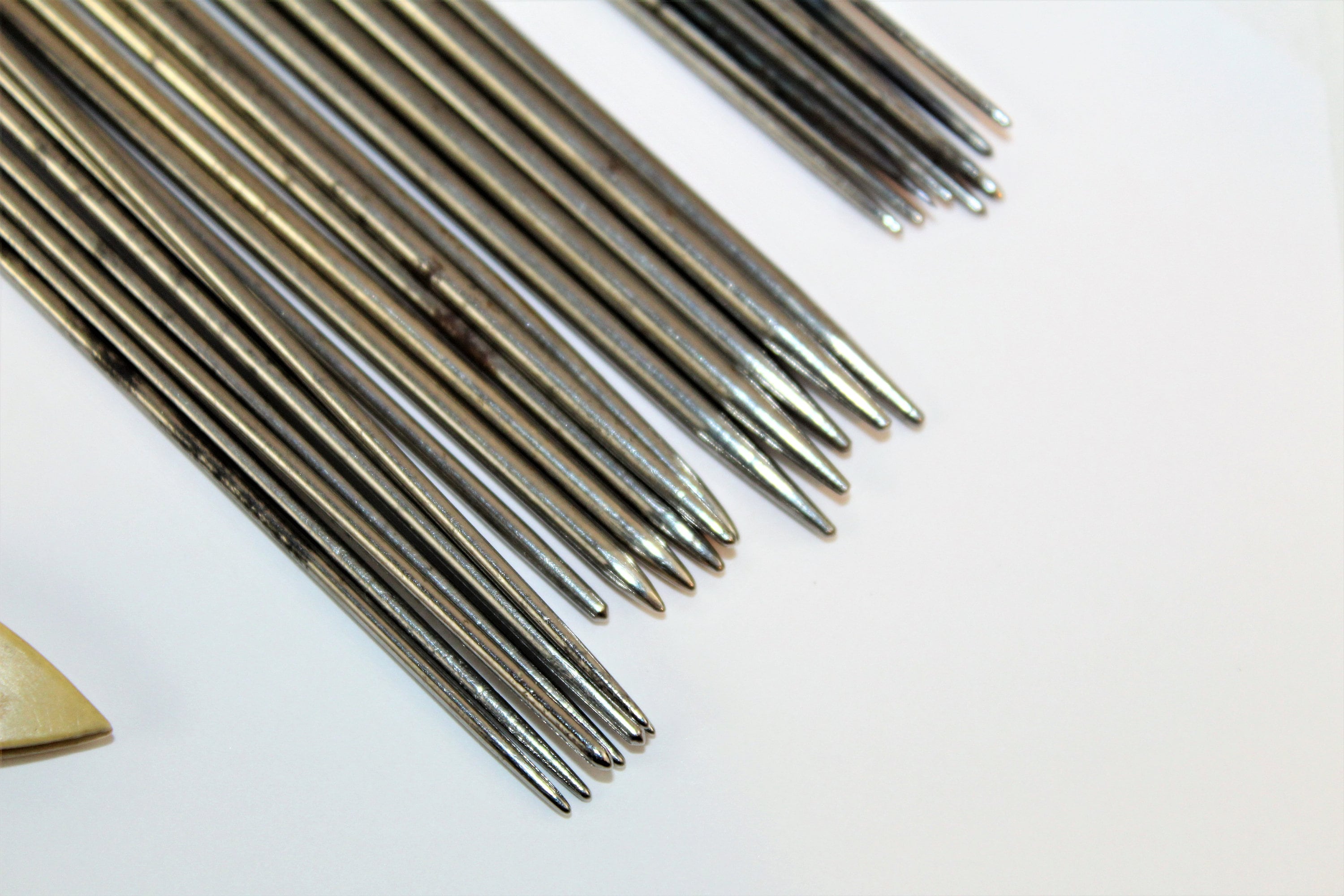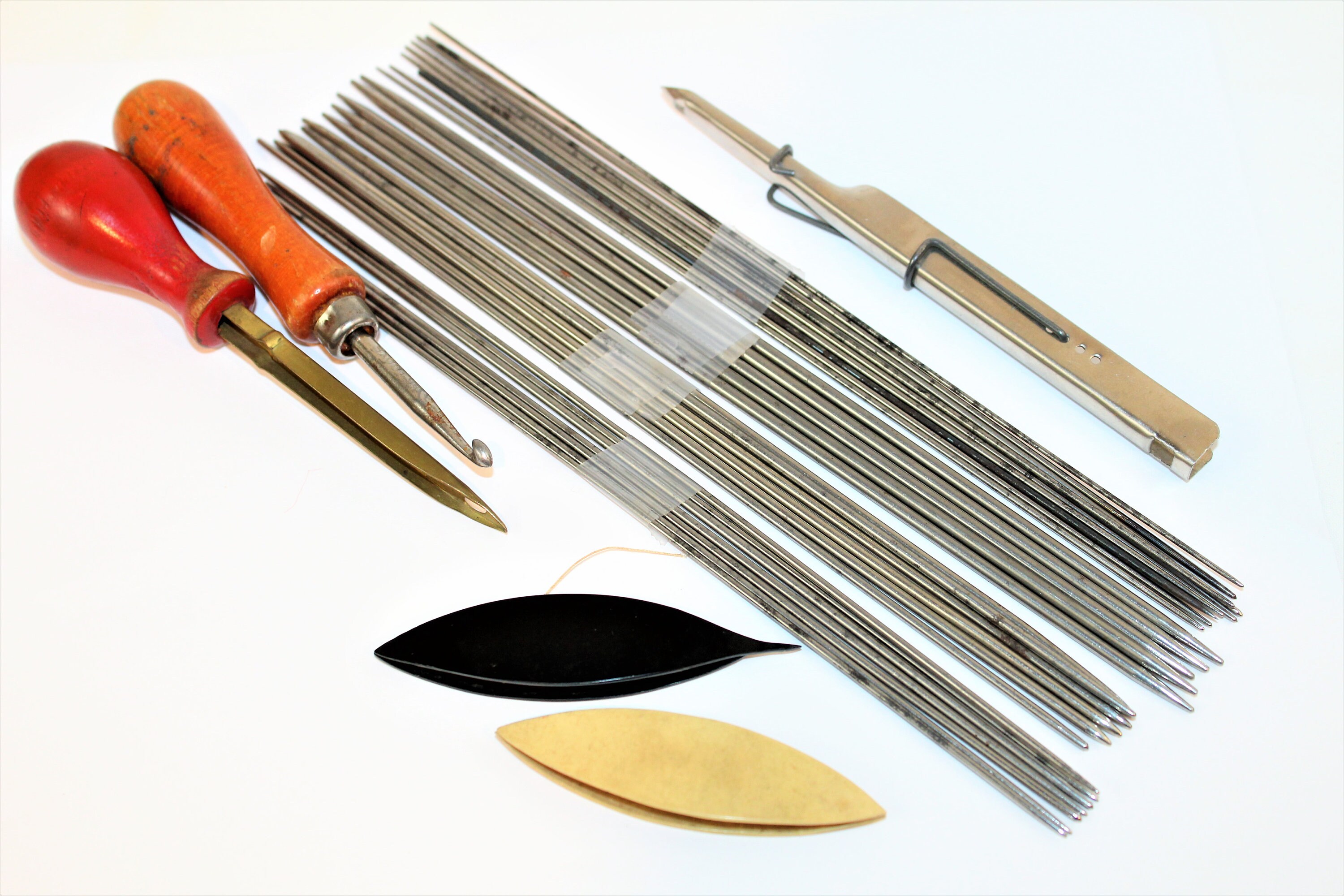 We have for sale a Fabulous lot of antique metal knitting needles (4 sizes), 2 tatting shuttles, 2 rug punches and a crochet hook. The knitting needles are double pointed, for working knits in the round. Great collectible or gift for a crafter or seamstress! Back in the day seamstresses made their own lace by tatting it. It is beautiful and as intricate as you want to make it.